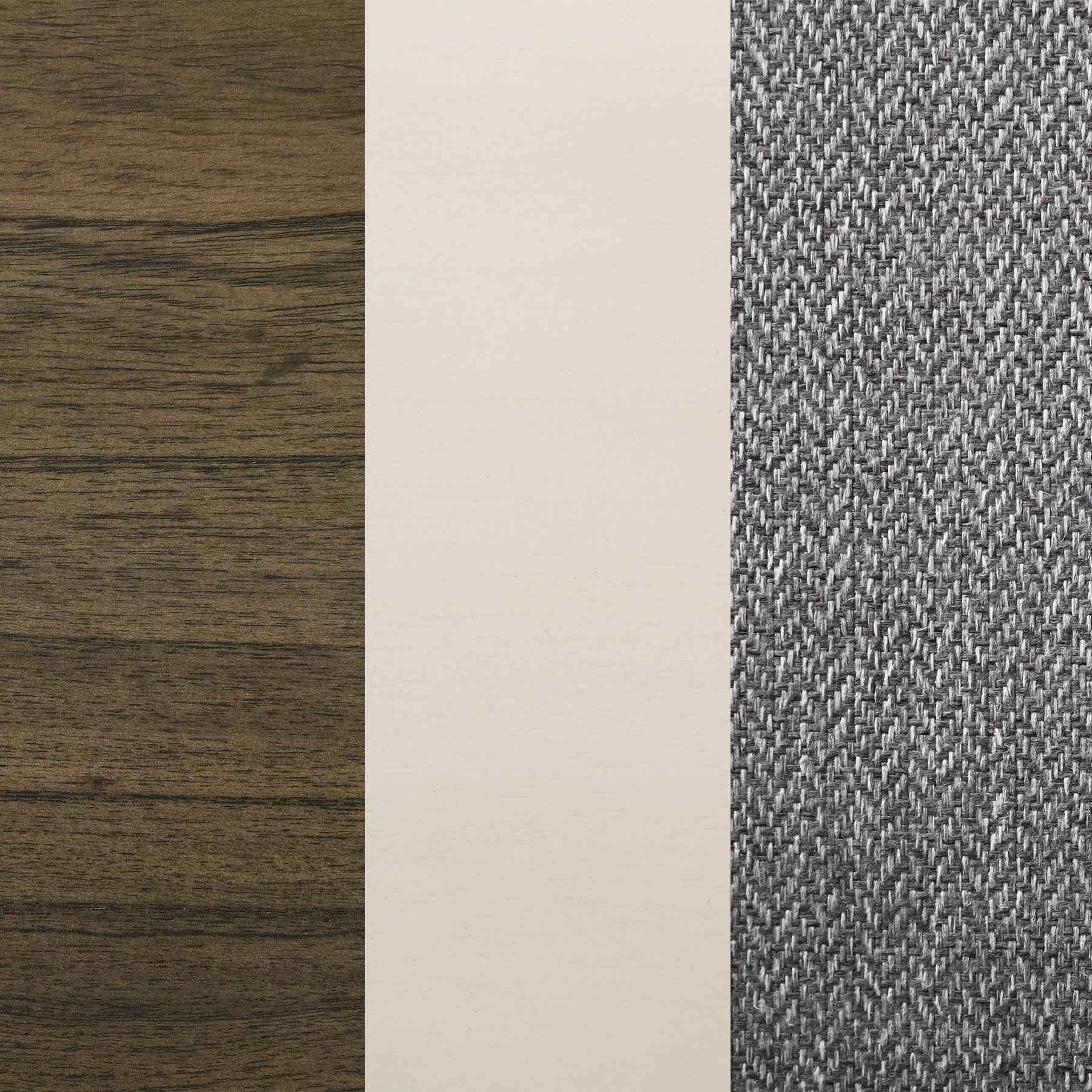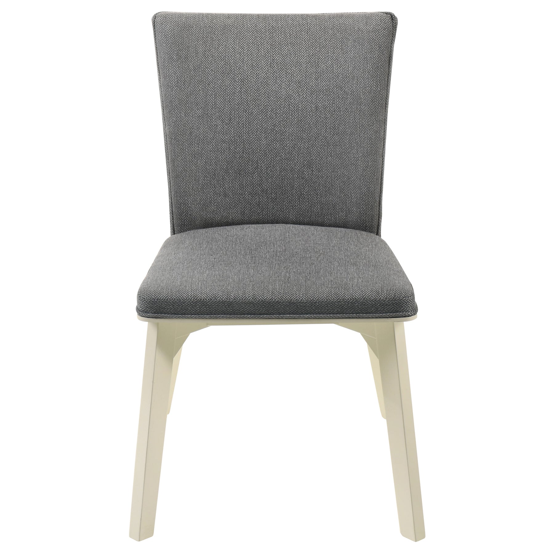 Refresh a family dining space with the cool hues and eye-catching design of this modern dining set. It includes a rectangular table and side chairs, creating an inviting centerpiece in your dining room or eat-in kitchen. The table boasts a two-tone finish with a rich wood grain tabletop complete with rounded corners, and a white finish base with chic angularity. Chairs are plush and comfortable, complete with gray fabric upholstery over plush cushions that create streamlined aesthetics in your space. The tri-tone combination is fresh and inviting, perfect for a welcoming space to catch up with friends and family. Key Features: • Complementary colors and engaging design highlight a modern rectangular dining table and chair set • Table features a rich wood finish tabletop with rounded corners that add a sleek, inviting ambiance • Intriguing base design on the table and side chairs features a white finish, adding airy contrast • Side chairs are constructed with X seat bases and feature soft gray upholstery over cushions • Tables includes levelers on its base to ensure a stable placement on any flooring type