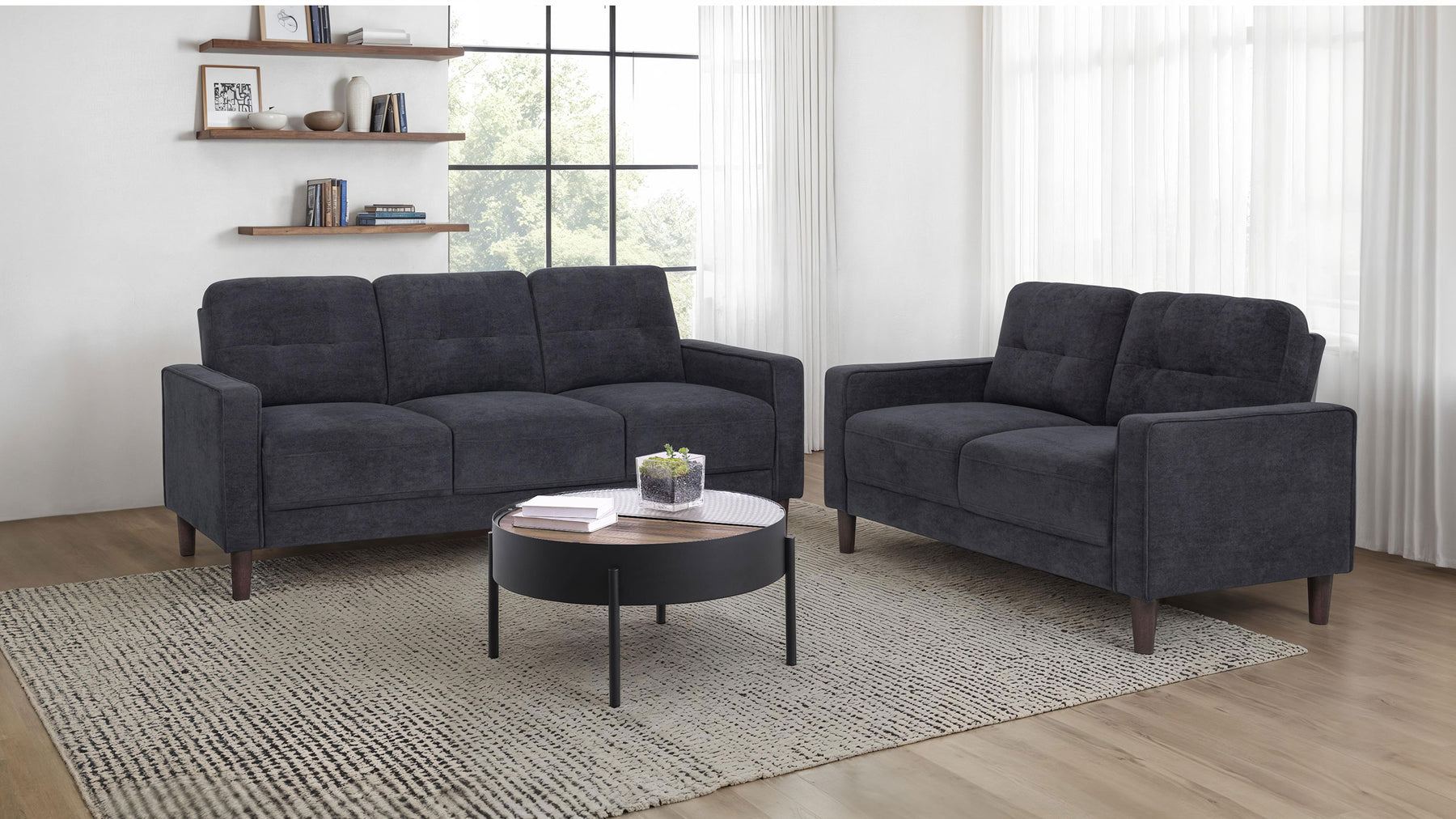 Simple yet thoughtfully detailed, this sofa set brings comfort and structure to compact spaces. Slim track arms with cord welt trim frame grid-tufted back cushions, while soft, textured upholstery creates a relaxed and inviting feel. Pocket coil seating offers lasting support, and tapered round legs provide a lifted foundation. Tailored and timeless, this collection is ideal for studio living or any room in need of space-conscious comfort. Key Features: • Sofa set with slim track arms and grid-tufted backs for clean lines and visual structure • Rust fabric adds soft texture and a versatile neutral tone to any room • Cord welt trim provides a tailored finish along arms and cushions • Pocket coil seating construction delivers consistent comfort and long-term support • Soft polyester upholstery is smooth, easy to care for, and family-friendly • Tapered round legs offer a stable, mid-century inspired lift to each piece
