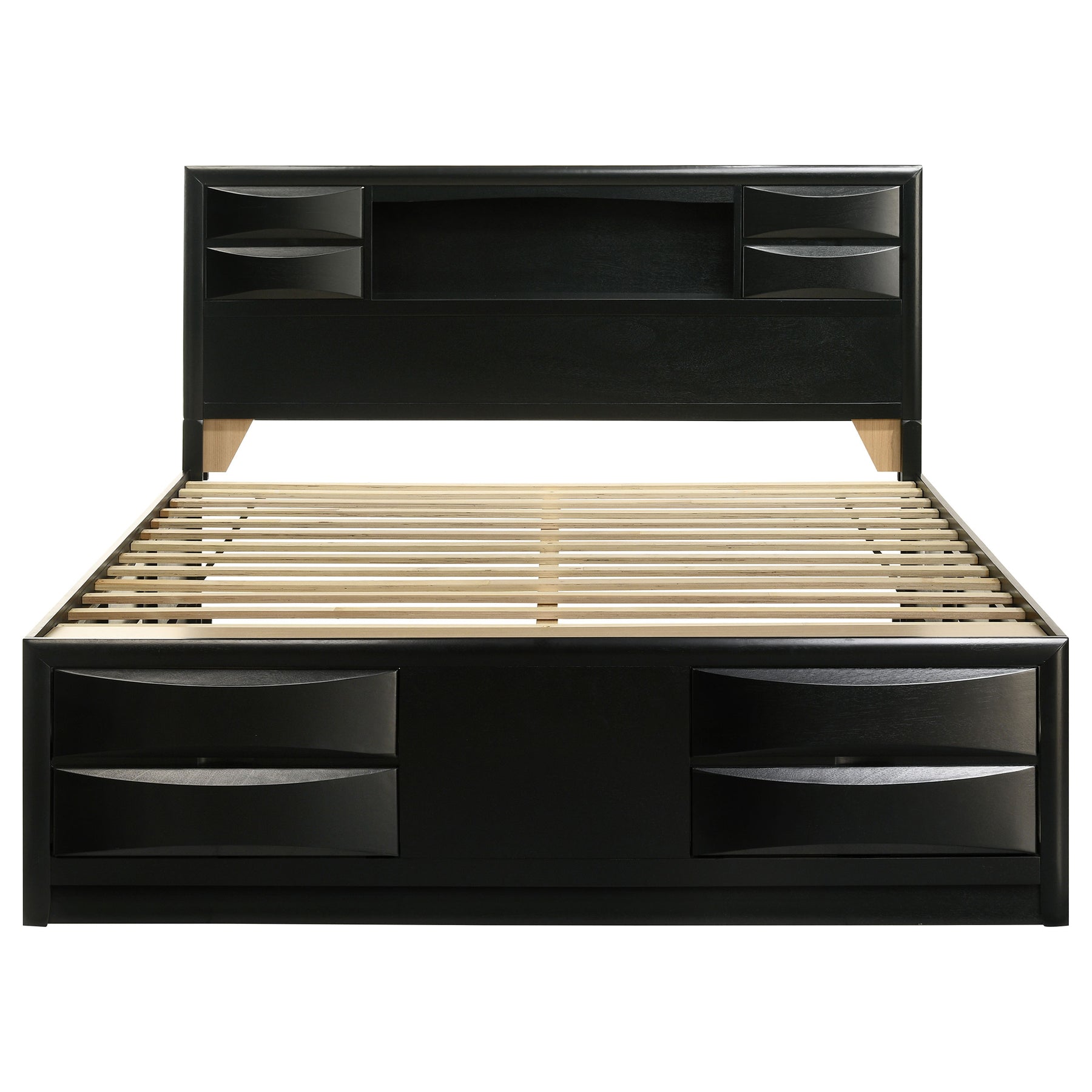 Elevate your bedroom with this modern bookcase storage platform bed finished in rich black. Thoughtfully designed for style and utility, it features four drawers in the headboard, four in the footboard, and convenient drop-down doors along the side rails for easy storage access. The bookcase headboard includes open shelving for books or décor, combining practicality with sleek design. Crafted from rubberwood, engineered wood, and okume veneer, this platform bed delivers lasting quality and eliminates the need for a foundation._x005F_x000D_ Key Features: • Queen bookcase storage platform bed with sleek transitional design • Four headboard drawers and open shelves for easy access storage • Footboard includes four drawers for linens and seasonal items • Side rails feature drop-down doors for concealed storage access • Rubberwood and engineered veneer construction ensures durability • Platform design supports mattress without box spring foundation