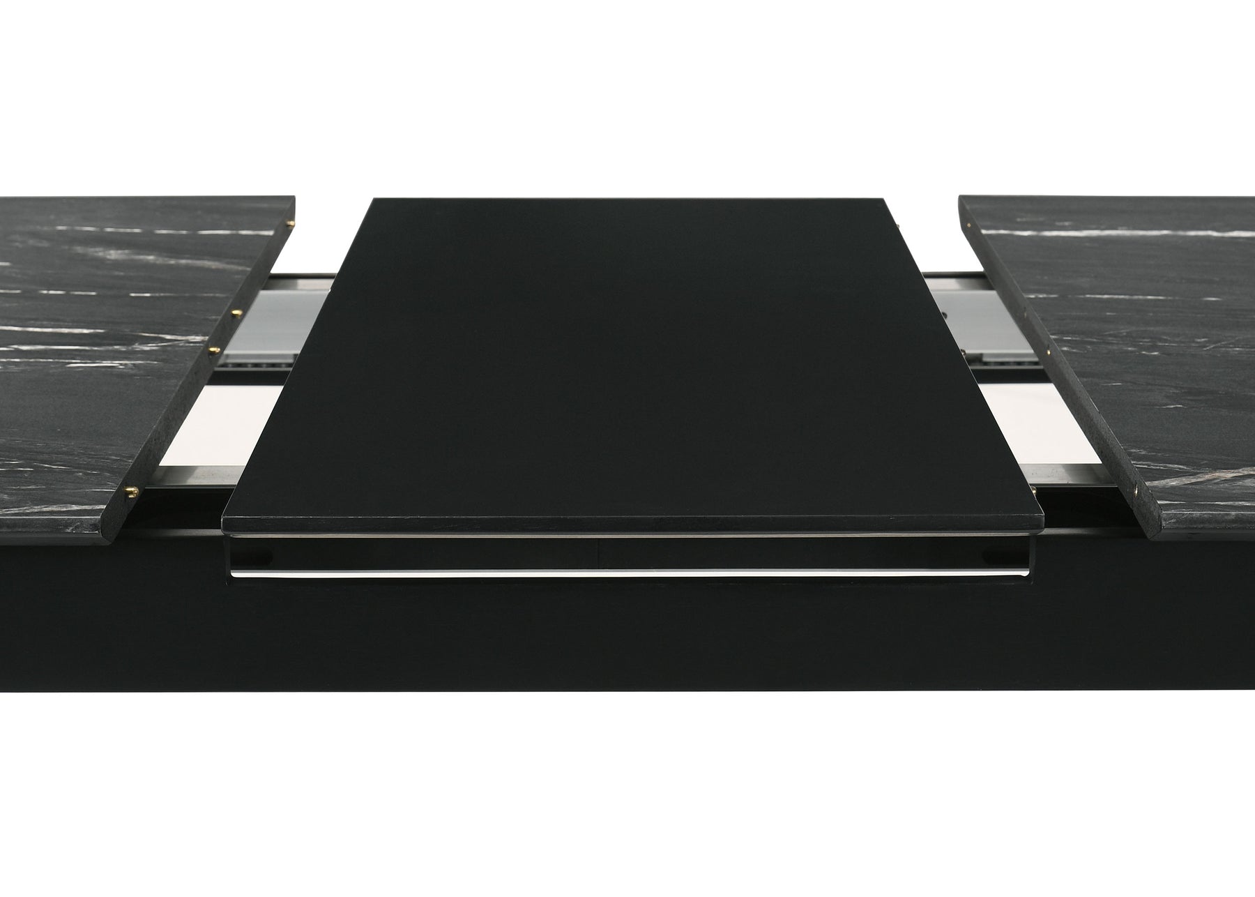 Envision your gatherings transformed with this exquisite dining set, where the sleek lines of modern design meet the timeless allure of faux marble. The table's luxurious black marble-esque top is a symphony of style, supported by fin-style legs that ground it with a touch of sophistication. As your ensemble grows with the seamless self-storing extension, the dining tableau adapts, offering a spacious stage for both feasts and intimate conversations. Accompanying the table, the Danish Y-shaped wishbone chairs, dressed in black and beige, whisper of coastal breezes and relaxed elegance, their form both a nod to tradition and a statement of contemporary grace. This dining set doesn't just host meals; it curates experiences. Key Features: • Elegant 5-piece dining set features a rectangular table with a striking faux marble top • Accommodates additional guests with a 16" self-storing leaf • Set includes six elegant wishbone side chairs in black with beige fabric cushions • The table's fin-style legs and chairs' tapered design provide a cohesive look • Both table and chairs boast durable construction, with materials chosen for longevity and ease of maintenance