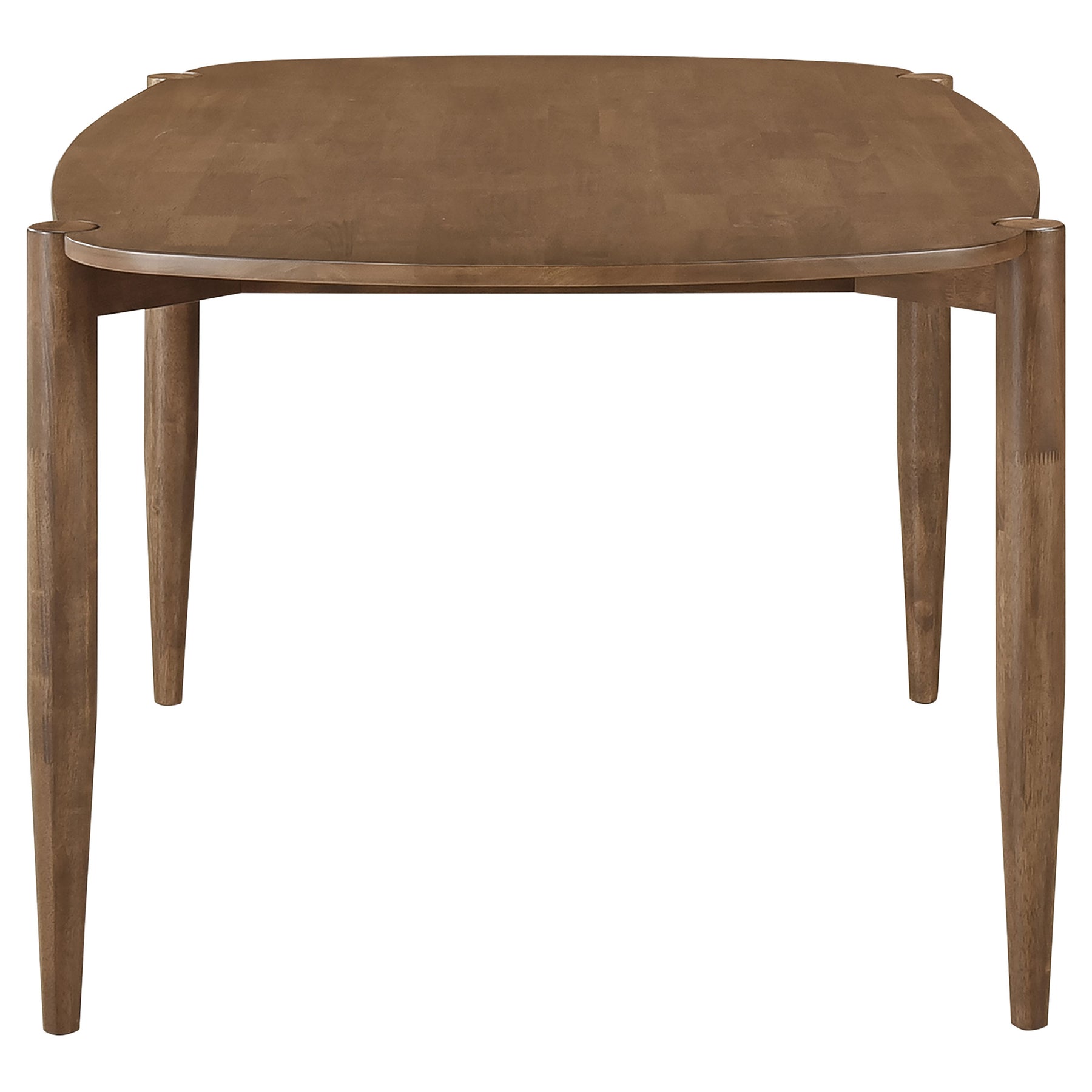 Indulge in a love of Euro-inspired fare that suits your discerning interior design requirements. This modern five-piece dining set is suited to both contemporary and transitional spaces, bridging motifs creating carefree aesthetics. Walnut finish rubberwood construction is sturdy without overly chunky, maintaining the clean lines you like to see. This set features a rectangular table with a straight edge top and rounded corners, as tapered legs are flush mounted as exterior side accents. Retro influence creates four chairs with curved backrests and nicely padded seat cushions upholstered with soft brown fabric. Key Features: • A clean, breezy aesthetic mimics iconic Euro-inspired style and a hint of mid-century modern flavor • Rubberwood construction with a warm walnut finish is versatile and inviting in your dining space • Rounded tabletop edges and a connected frame begin an efficient design with pleasing impact • Tasteful tabletop design drops into a base frame with legs visible from floor to top • Charming chairs feature high, curved backrests and nicely padded cushions with brown upholstery • Versatile finish and low-key design in this five-piece dining set add a perfect look for your casual kitchens and dining rooms