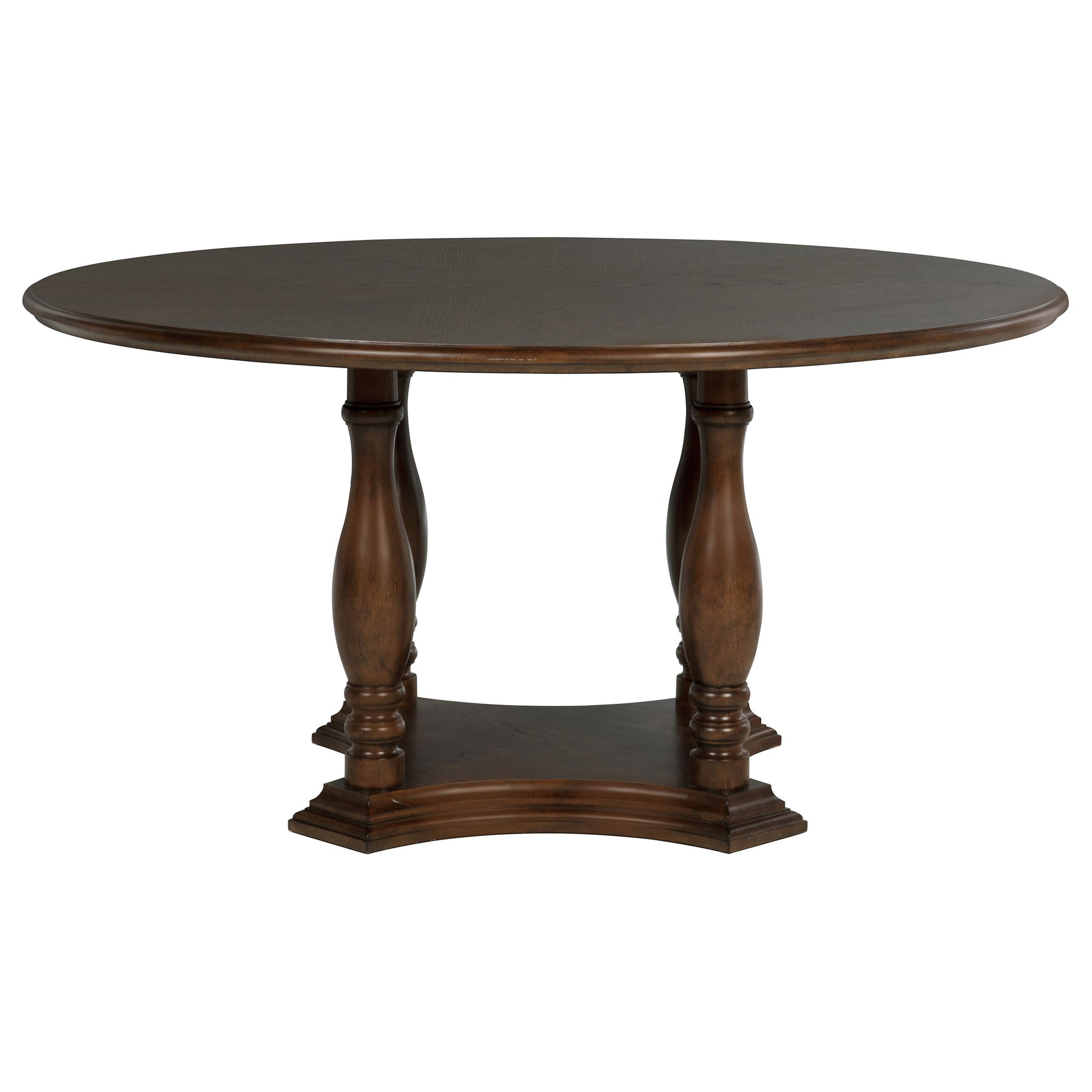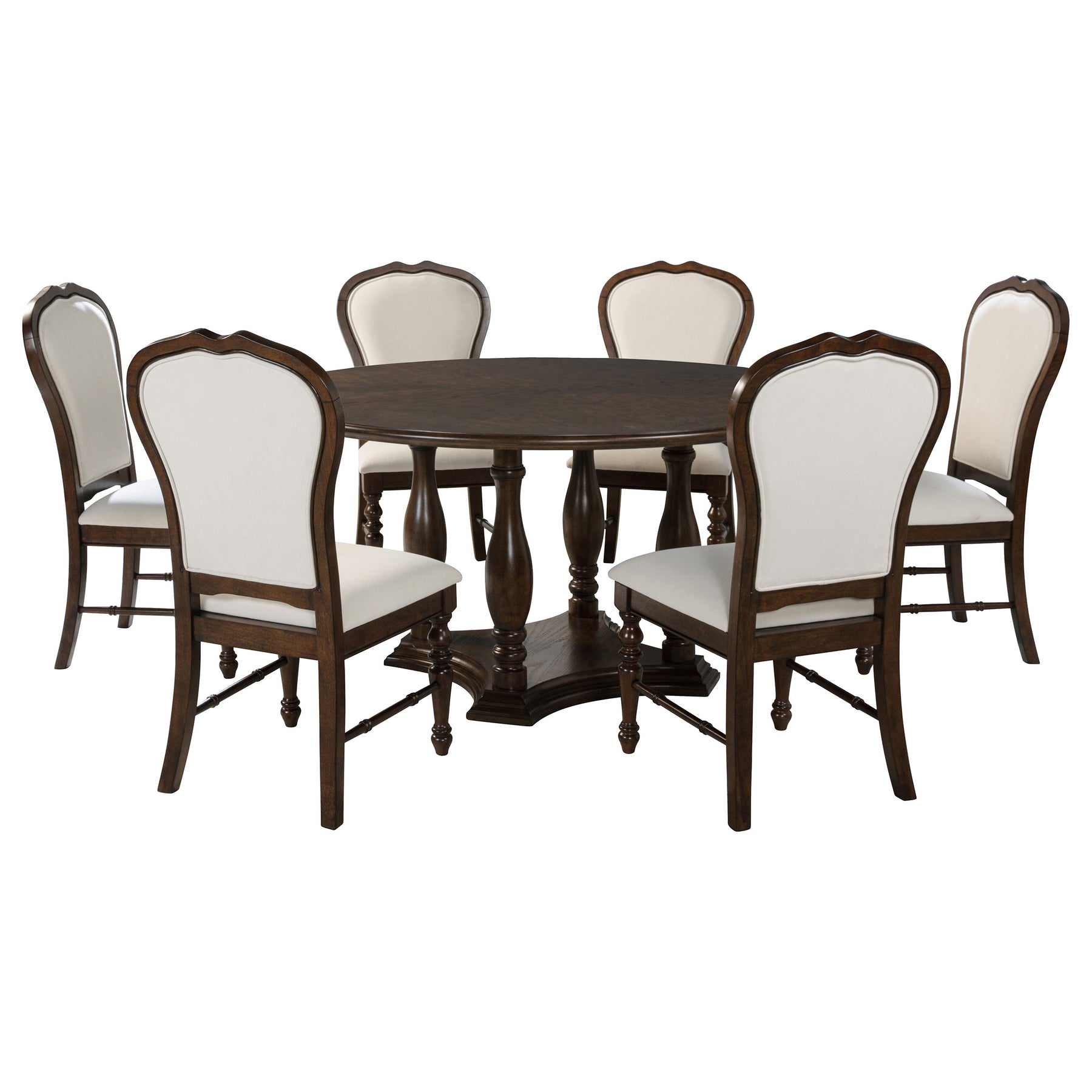The combination of ivory upholstery and a rich brown wood finish creates clean, precise style for this traditional round dining set. Its crafted in quality rubberwood and engineered wood, delivering strength and durability paired with turned details. The table features a spacious r with a decorative edge and charming base design. Chairs add rounded, framed backs and plush foam cushions, perfect for leisurely meals with family and friends. The set lends handsome, refined character in your dining room or kitchen. Key Features: • This traditional round dining set delivers refined but approachable aesthetics to your home • A rich brown finish is deep and dark, offering warmth and timeless character • Turned style legs, stretchers and table base add curvature and detail for an elegant presentation • A round tabletop features a decorative edge and provides seating for four to six • Set is made from durable and strong rubberwood, engineered wood and oak veneer