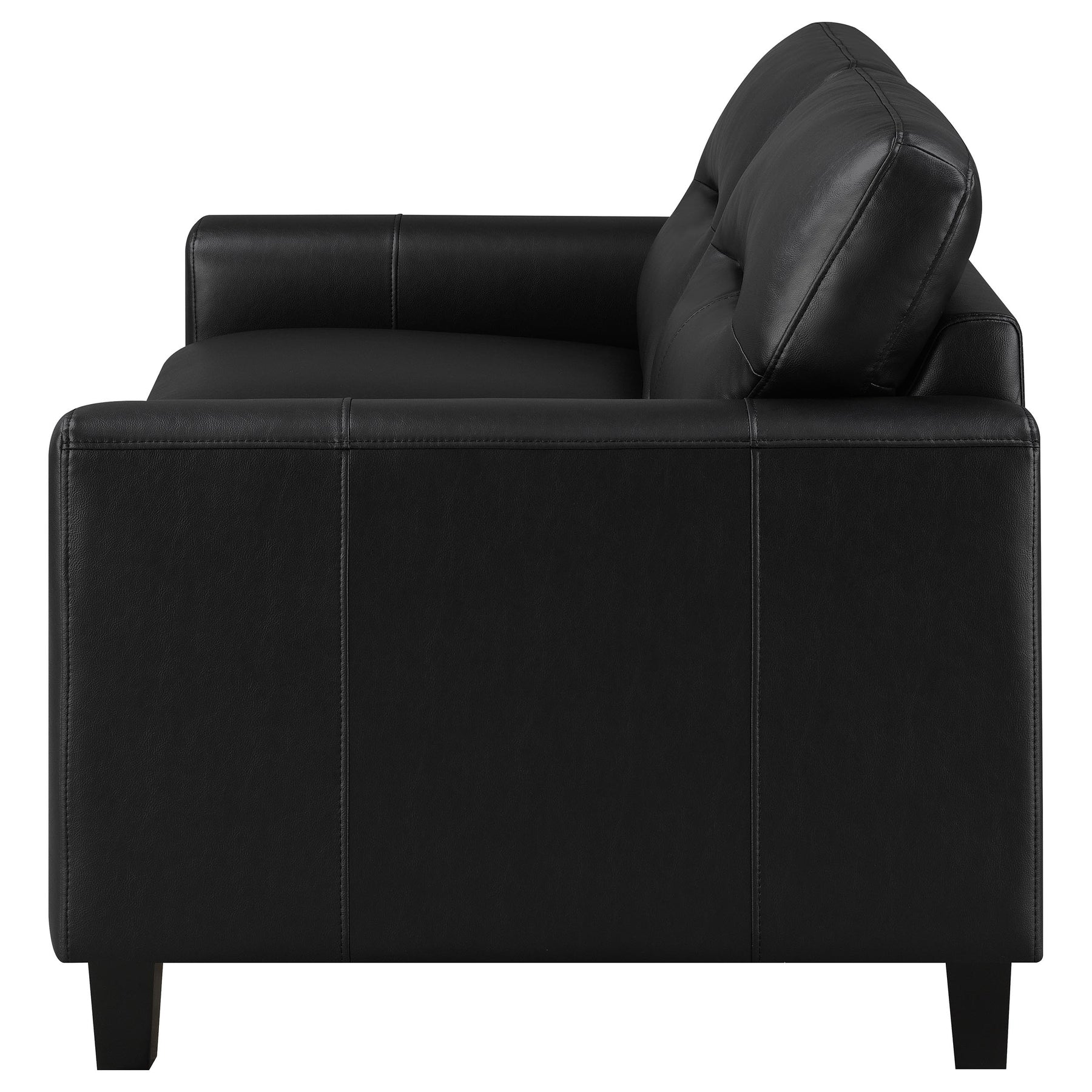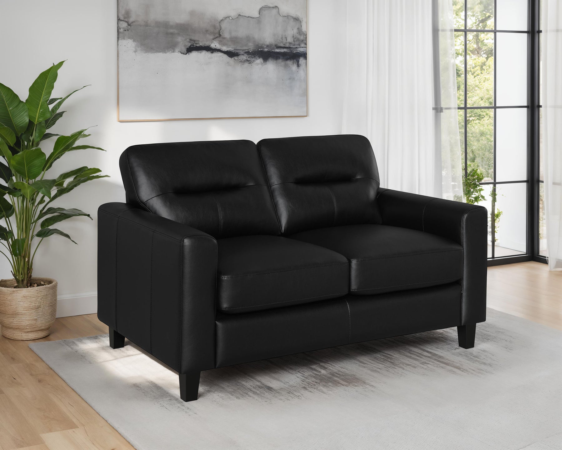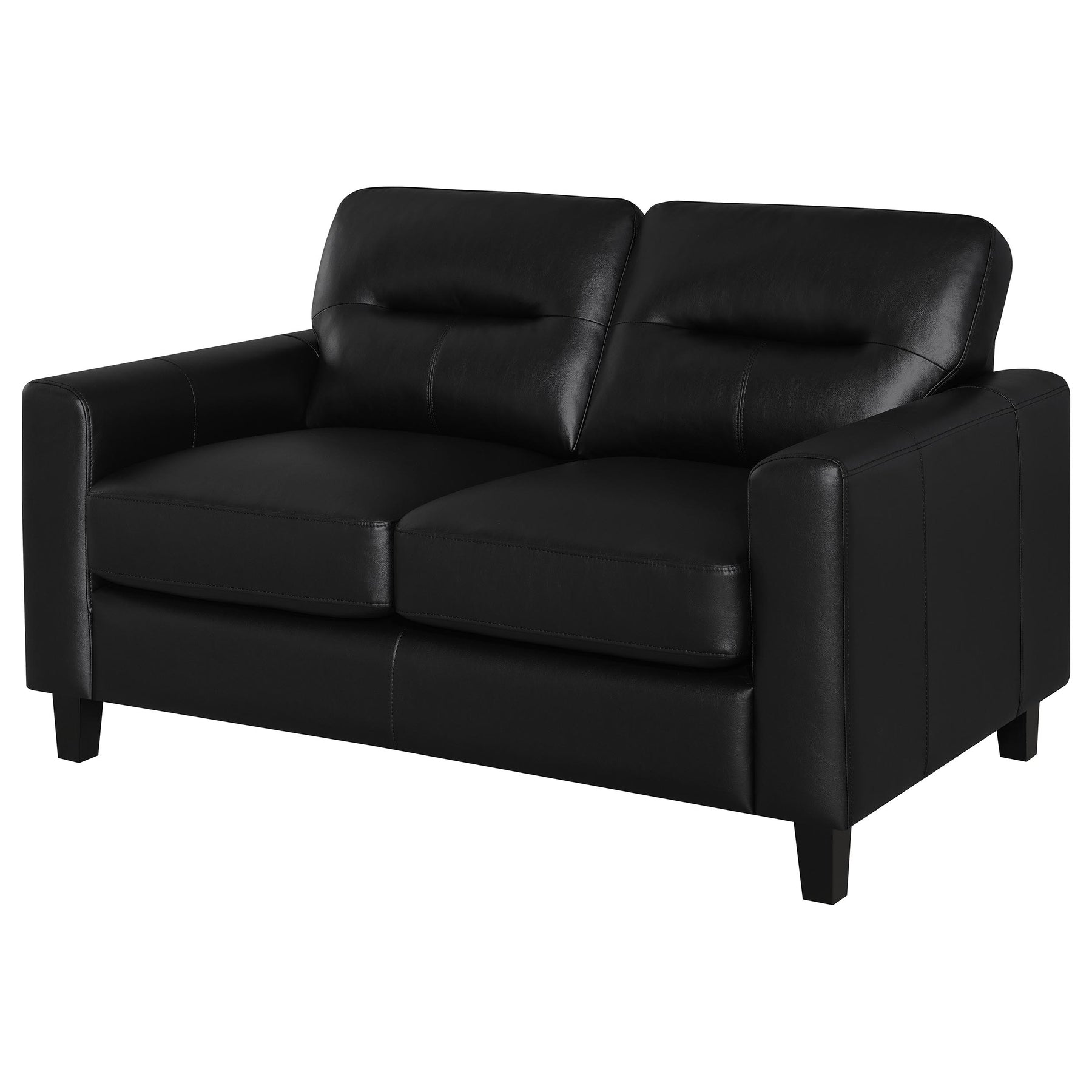 Balanced in scale and quiet in confidence, this loveseat offers a space for connection and calm. Its clean silhouette is framed by broad arms and softened by plush seating wrapped in smooth upholstery. Gentle stitching adds a hint of refinement across each surface. Crafted to complement the room or stand alone in smaller settings, it invites shared comfort and effortless repose. Key Features: • Loveseat with structured track arms and padded seating for compact comfort • Black leatherette finish enhances the modern profile with a smooth surface • Defined cushions offer medium-firm support with tailored topstitch detail • Block-style legs match body color for consistent visual appeal • Crafted from pine, plywood, foam, and leatherette upholstery throughout • Perfect for small-scale seating or pairing with matching collection pieces
