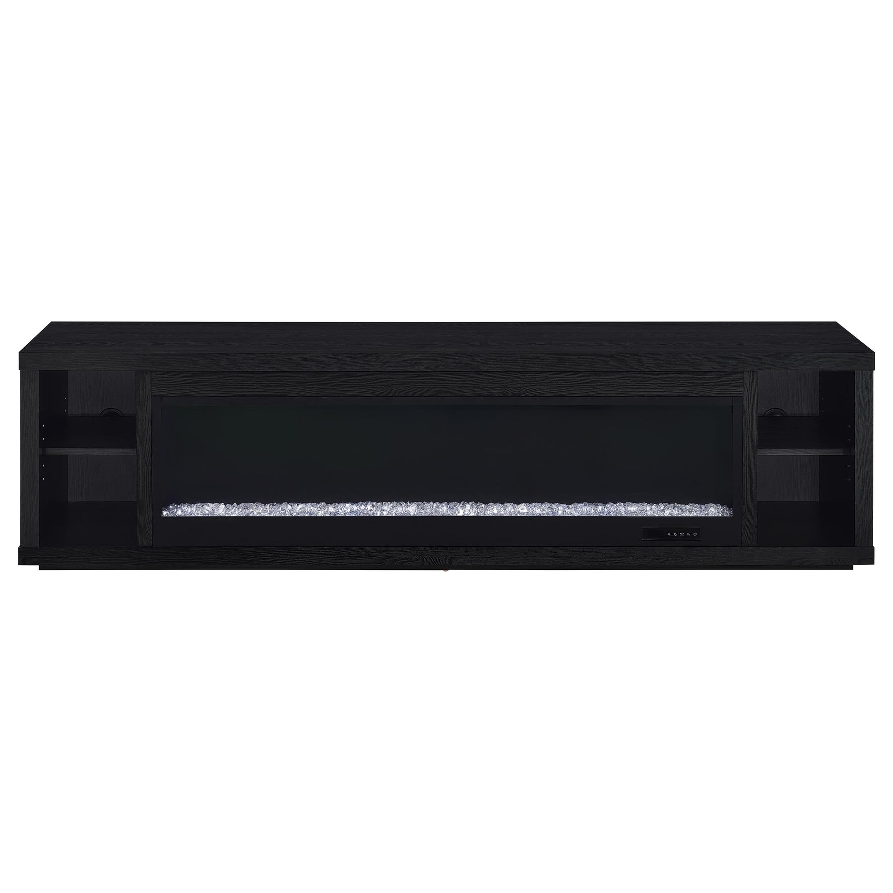 This sleek fireplace media console brings warmth and streamlined storage to contemporary living spaces. A wide electric firebox glows over crushed acrylic crystals, offering fifteen customizable flame colors operated by a wireless remote. Open side compartments with adjustable shelves store devices or décor, while rear cable management cutouts keep wires out of sight. Finished in classic black and crafted from engineered wood with a laminate veneer, it serves as a refined TV stand or entertainment center. Please note that this console does not include a heat function. Key Features: • TV stand fireplace console with flame visualizer and crushed acrylic crystals for visual warmth • Black finish highlights clean lines and adds bold, modern character to any space • Two open side compartments with adjustable shelves offer flexible display or storage • Fifteen flame colors with wireless remote control for lighting customization • Crafted from engineered wood and durable, scratch-resistant laminate veneer • Accommodates TVs up to eighty-five inches with rear cutouts for cable management