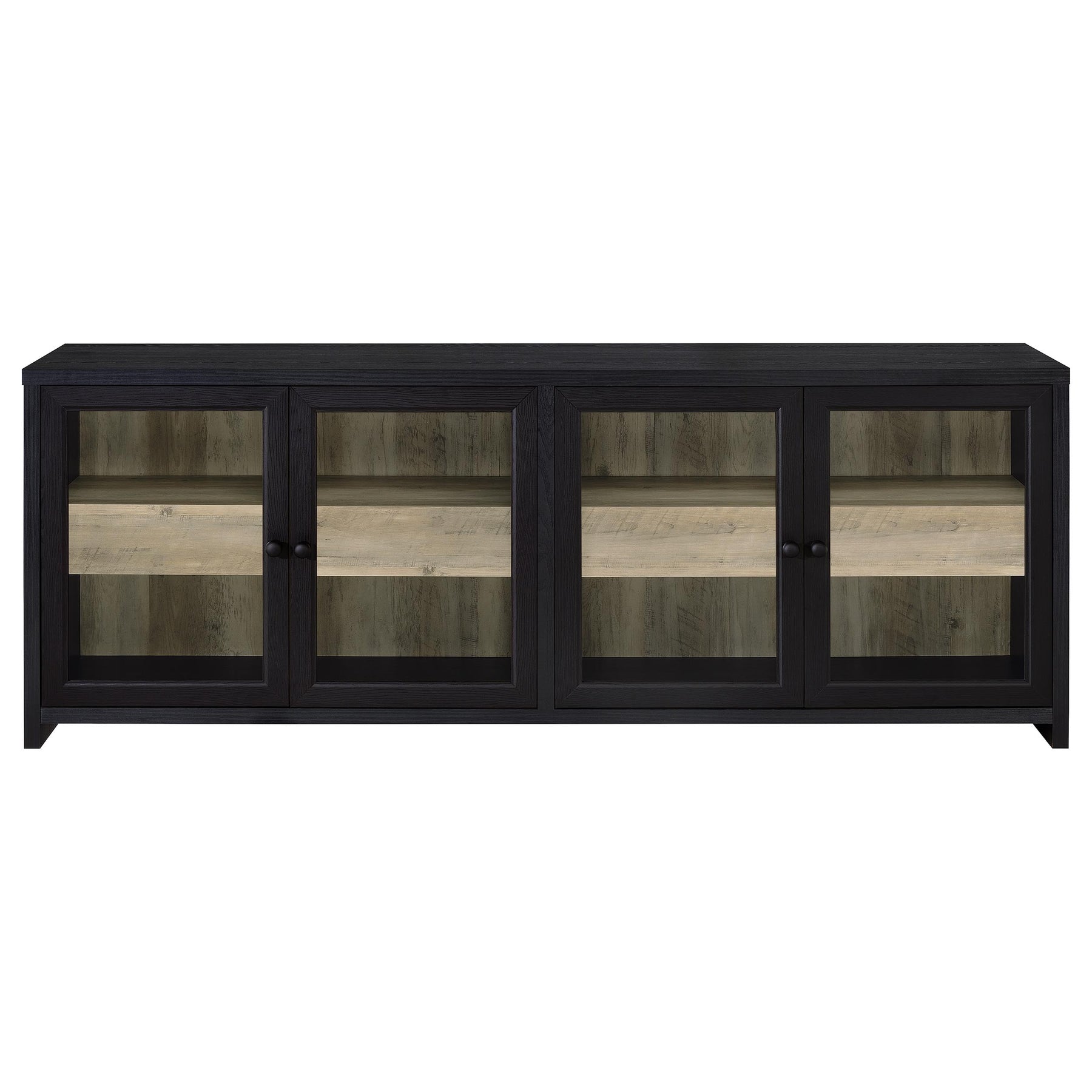 This expansive media console merges bold presence with discreet practicality. Framed in a striking black finish, four glass doors reveal warm wood-look interiors with hidden drawers behind each panel—perfect for tucking away remotes, devices, and essentials. The broad surface accommodates TVs up to 85 inches, while fixed shelving enhances display or storage flexibility. Crafted from engineered wood and clear glass with gunmetal hardware, it delivers a grounded, modern-rustic statement for any living room. Key Features: • TV stand media console with four framed glass doors and concealed interior drawers • Black exterior finish contrasts with warm natural-look interiors for bold appeal • Each cabinet includes a hidden drawer and shelf for discreet, organized storage • Framed glass doors with gunmetal hardware offer visibility and sleek durability • Accommodates TVs up to eighty-five inches with a wide, sturdy top panel • Crafted from engineered wood, melamine veneer, and tempered clear glass