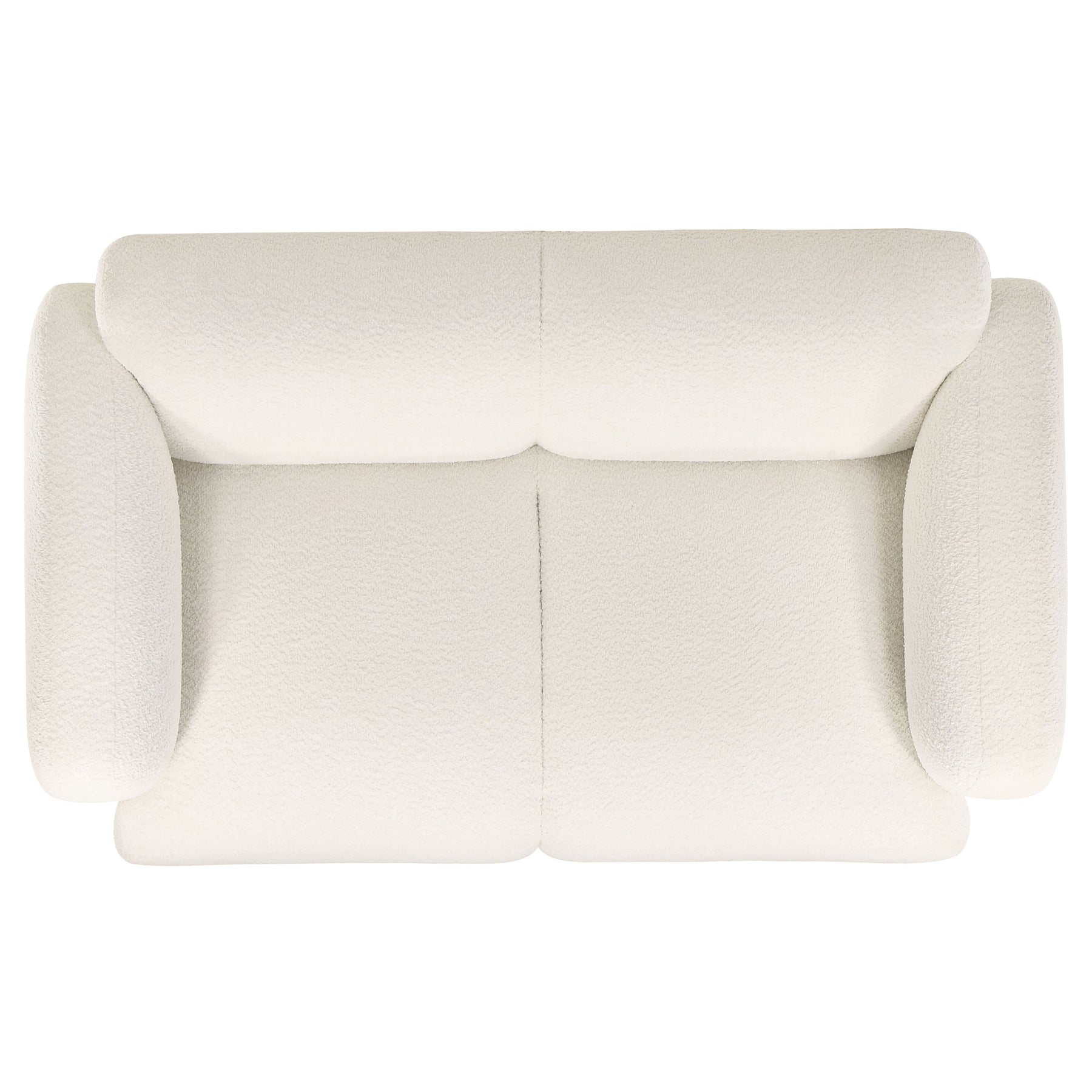 This sculpted loveseat brings bold softness and inviting texture to modern spaces. Its low-profile frame is wrapped in richly textured fabric with a cozy, tactile feel. Rounded track arms and a smooth, contoured silhouette create a cocoon of comfort. High-quality foam and pocket coil seating ensure long-lasting support without sacrificing softness. With a clean, minimal form, this two-seat loveseat adds warmth and refined presence to any living room or lounge. Key Features: • Two-seat loveseat with low-profile, sculptural silhouette and soft, rounded edges • Textured white fabric upholstery offers warm tone and inviting hand feel • Curved track arms and contoured frame provide supportive modern style • High-quality foam padding adds plush comfort to every seating zone • Pocket coil seating delivers durable support and shape retention • Perfect for compact living spaces seeking soft form and relaxed design