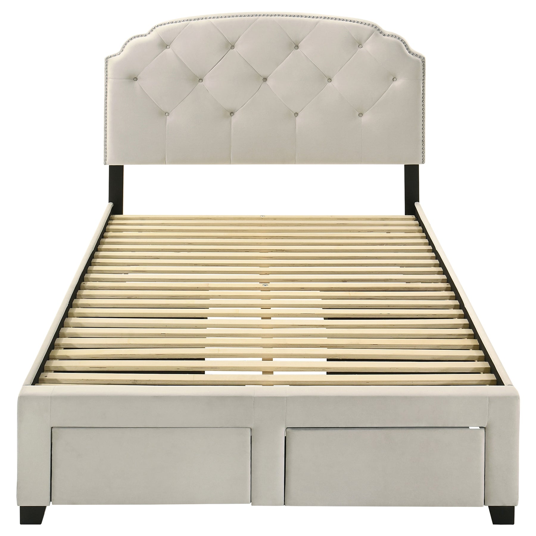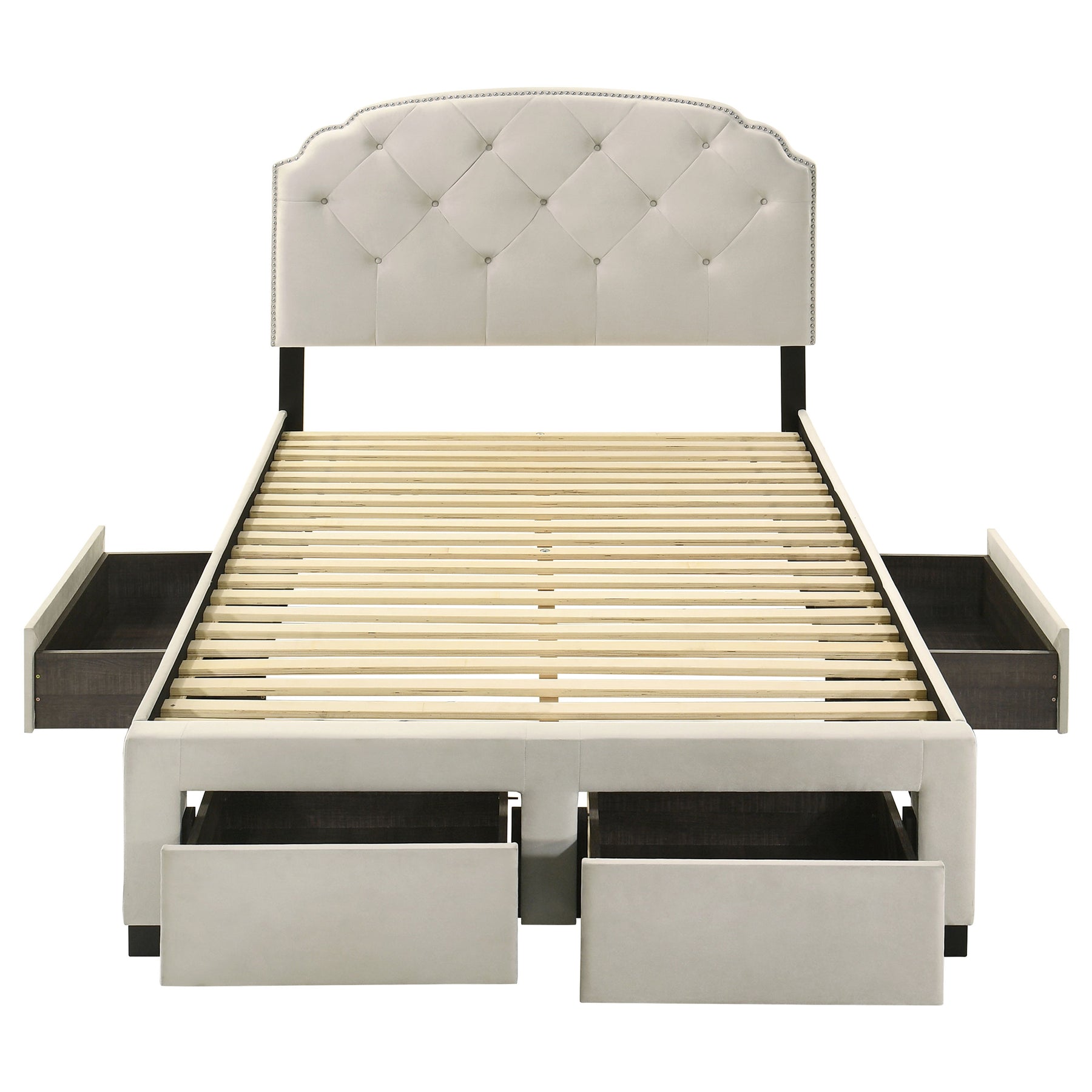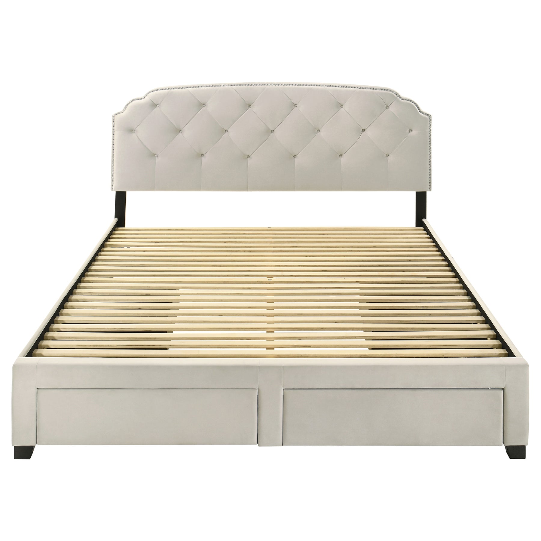 Indulge in comfort and utility with this platform storage bed, where graceful design meets everyday practicality. A tufted velvet headboard with gentle curves and nailhead trim brings refined elegance, while four built-in drawers offer generous hidden storage. Expertly crafted from rubberwood, engineered wood, and foam, this fully slatted frame eliminates the need for a foundation. It's a sophisticated solution for streamlined, serene living. Key Features: • Queen platform bed with scalloped tufted headboard for graceful tailored dimension • Cream velvet upholstery with button tufting and nickel nailhead trim for elegance • Includes four spacious drawers for concealed clothing or linen storage solutions • Fully slatted base supports mattress directly with no foundation or box spring • Built from rubberwood and engineered wood for stability, durability, and strength • Foam-filled headboard adds comfort while combining classic detail with function
