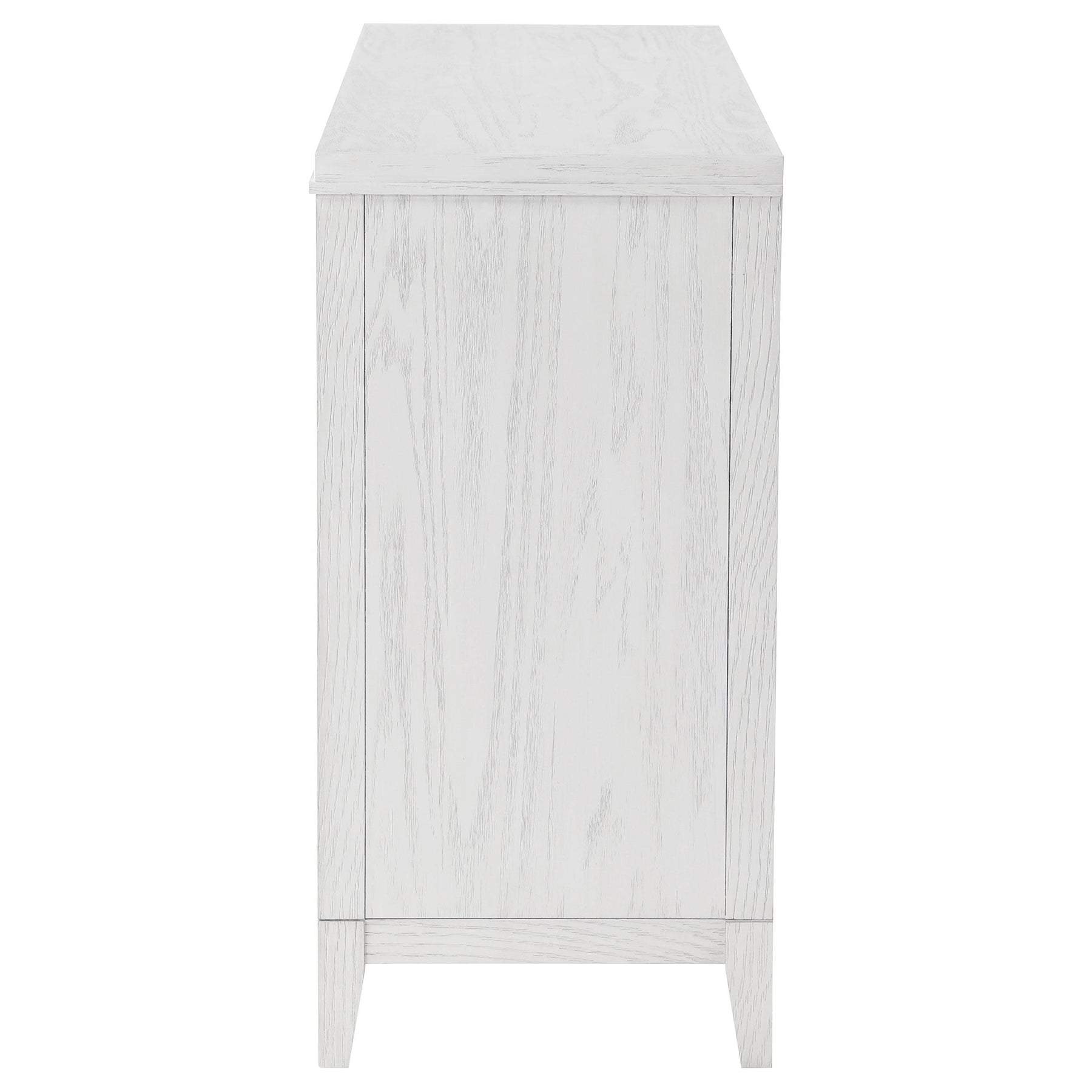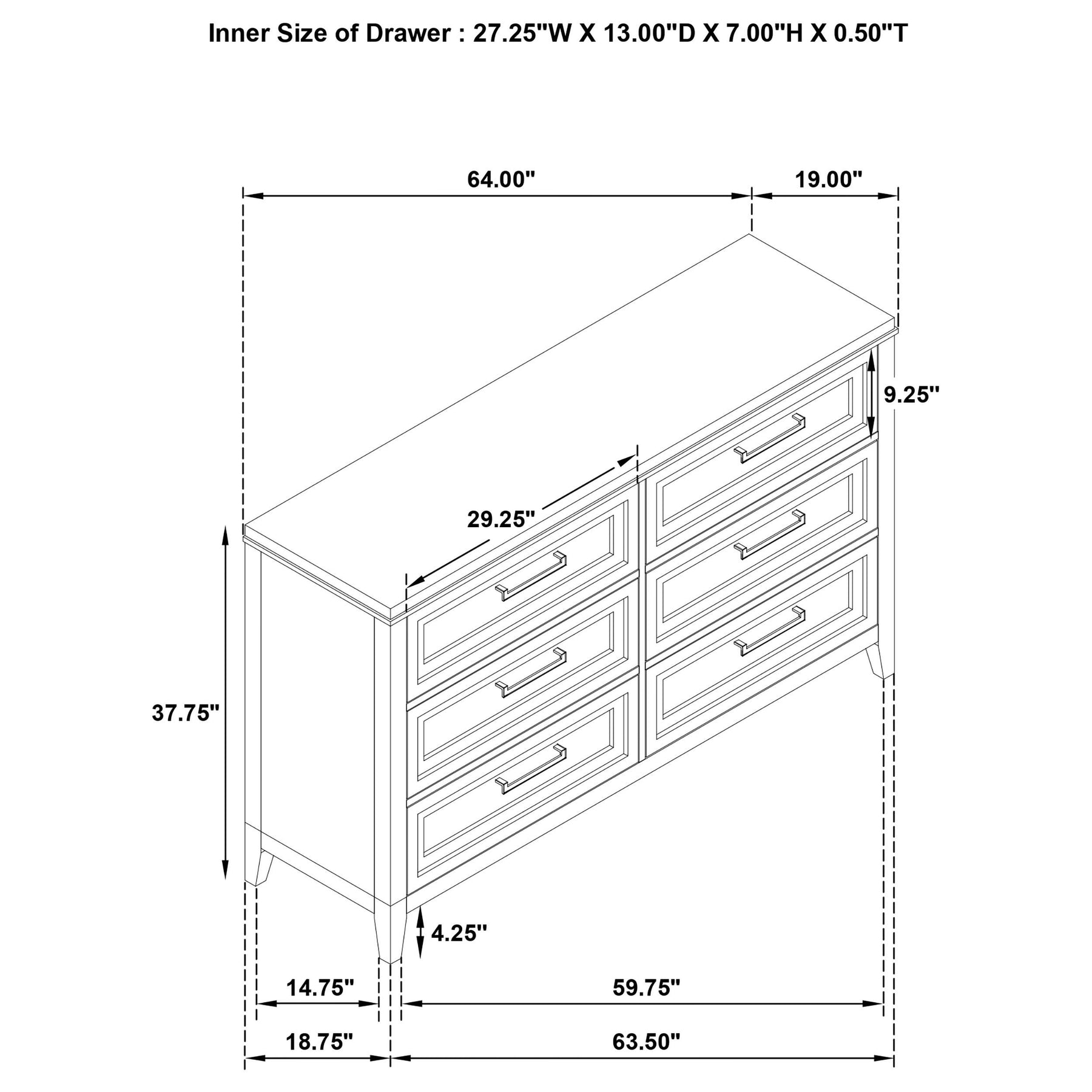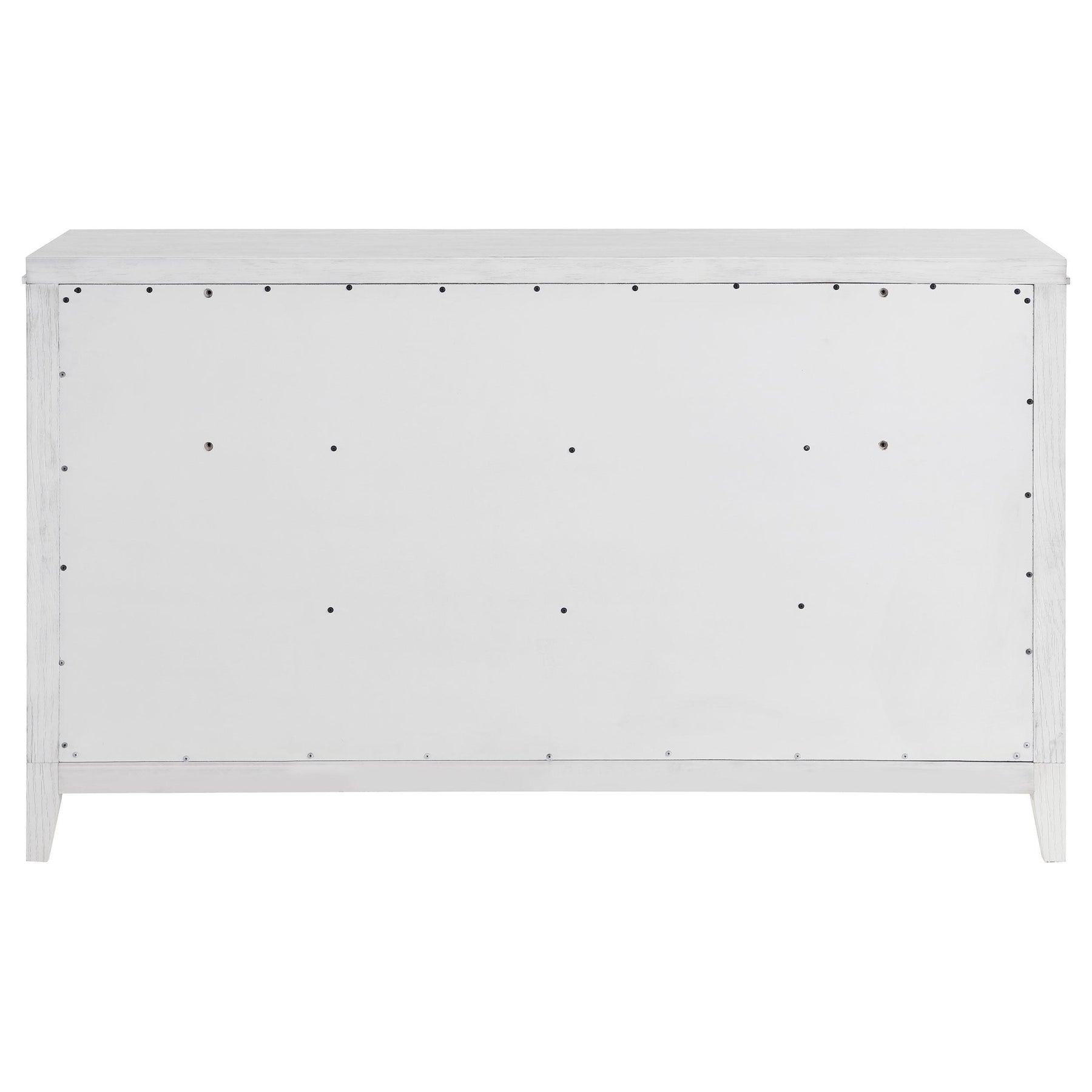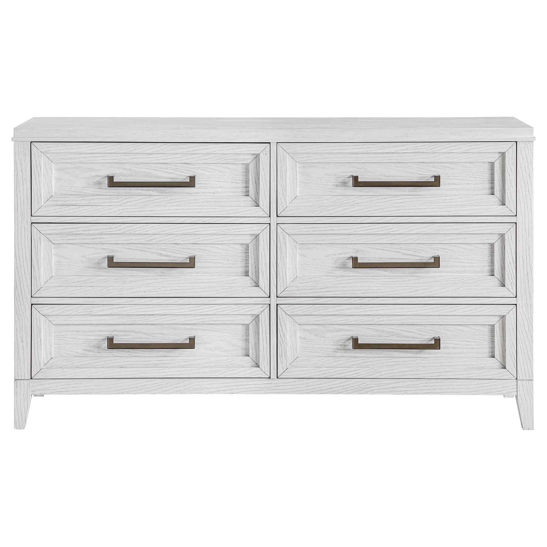 Light distressing offers depth and dimensionality to a modern six-drawer dresser. Perfect for clothing and other accessories, it features a double profile with three drawers on each side. A white finish allows wood grain details to show through, creating organic character and texture. Drawer fronts are a stepped design that adds artistry, with long antique brass toned pulls that add contrasting depth. use the wide top for personal effects like a jewelry box or valet and framed photos. Key Features: • Add easy bedroom storage with six roomy drawers in a modern dresser • Distressed white finish allows light wood grain detail to show through, adding character • Stepped drawer front design creates depth and dimensional character • Long bar pulls add contrast with a antique brass toned finish and angular design • Includes a tip-over restraint for added safety and peace of mind