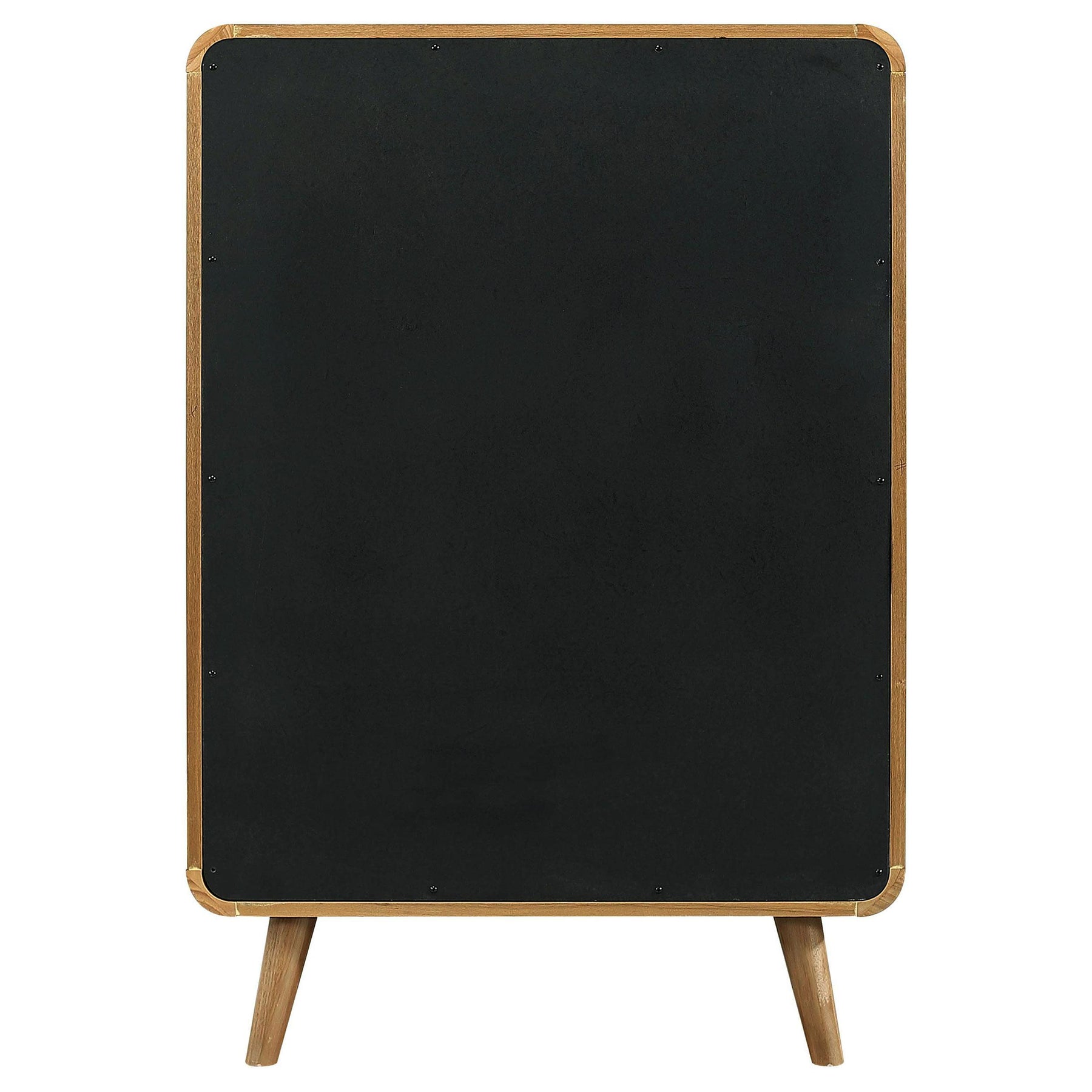 Stylishly organize your wardrobe with this mid-century modern chest of drawers, built with pine, engineered wood, and walnut veneer for durability and style. Featuring five spacious drawers, it offers ample storage for clothing and accessories. Rounded edges and tapered legs lend retro flair, while felt-lined top drawers add a touch of functionality. Smooth drawer glides and subtle metallic hardware complete this elegant storage piece. Key Features: • Five-drawer chest with a dark walnut finish for a bold look • Rounded edges and tapered legs enhance retro-inspired charm • Felt-lined top drawer provides safe storage for valuables • Pine, engineered wood, and walnut veneer construction ensures sturdiness • Metallic hardware adds a polished finishing touch • Smooth-gliding drawers offer effortless access