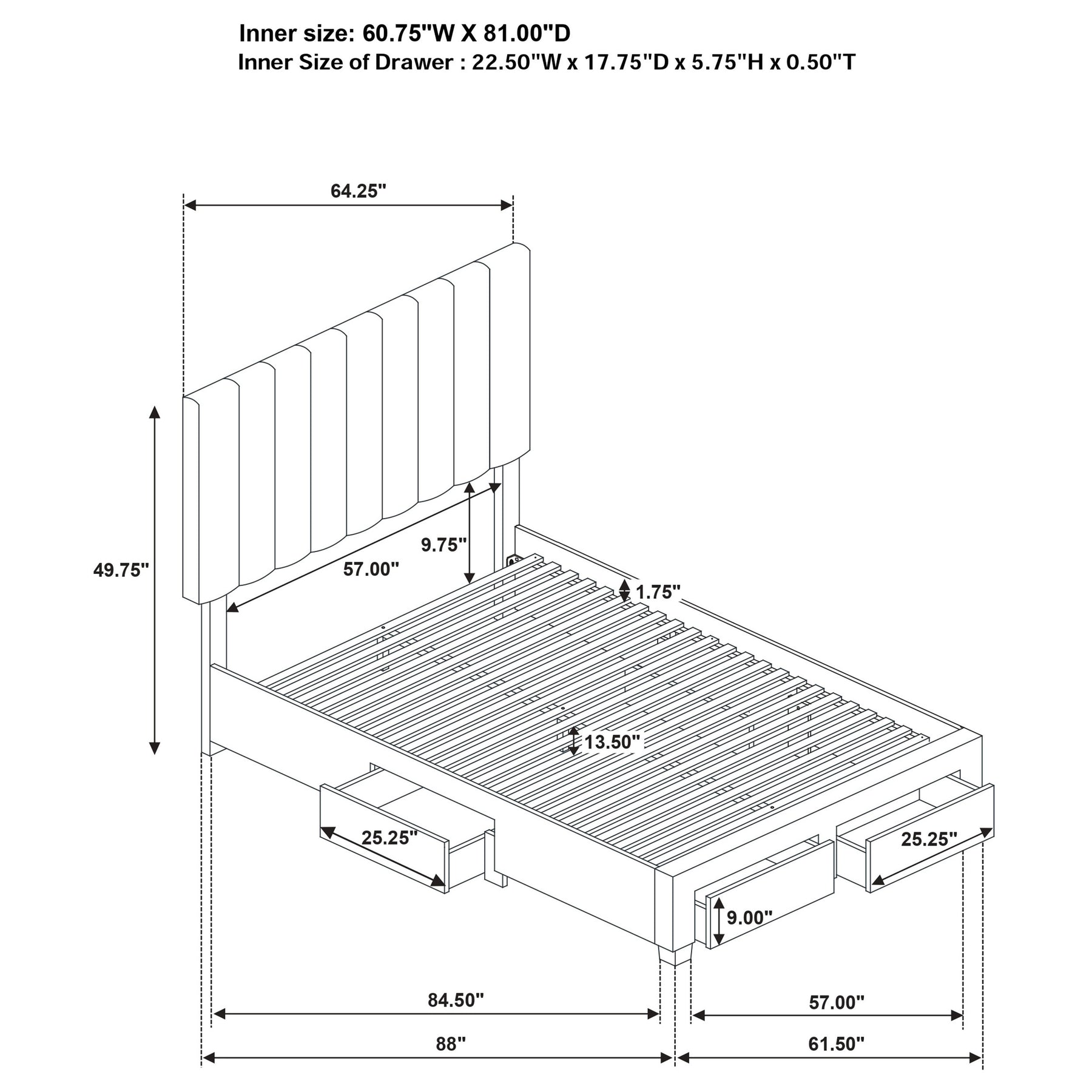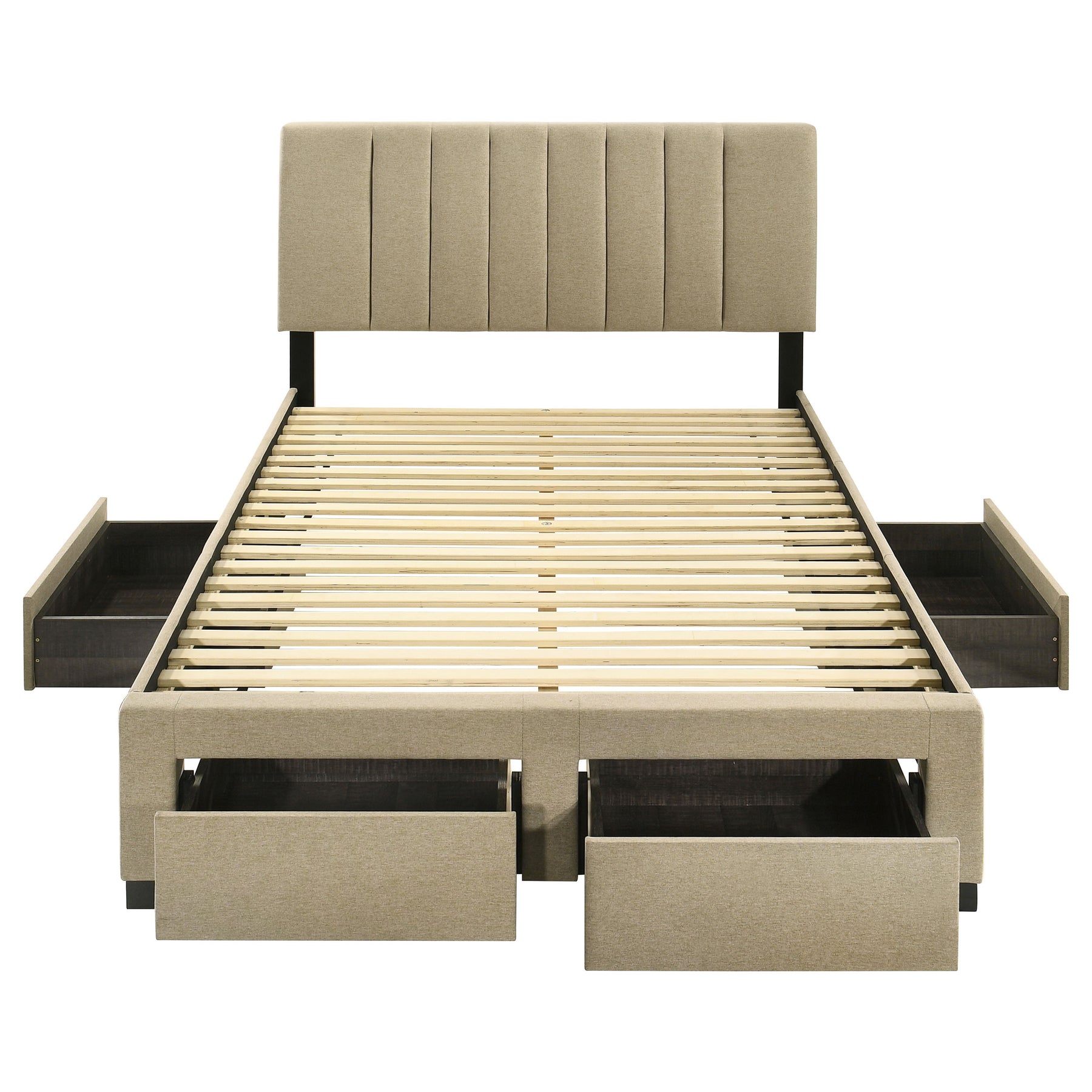 Clean lines and quiet storage come together in this upholstered platform bed, where form meets thoughtful function. The vertical channeled headboard adds a tailored touch, while built-in drawers offer seamless storage at the foot and sides. Wrapped in a soft woven fabric and anchored by a weathered mango base, it blends comfort, utility, and calm geometry. Designed for uncluttered rest, it grounds the bedroom with ease and intention. Key Features: • Upholstered queen bed with vertical channel tufting across a clean, tailored headboard • Four drawers integrated into the base for discreet side and footboard storage • Platform design supports mattress directly without the need for a box spring • Ideal for compact sleeping areas where storage and function are essential • Crafted from mahogany, engineered wood, and mango veneer throughout
