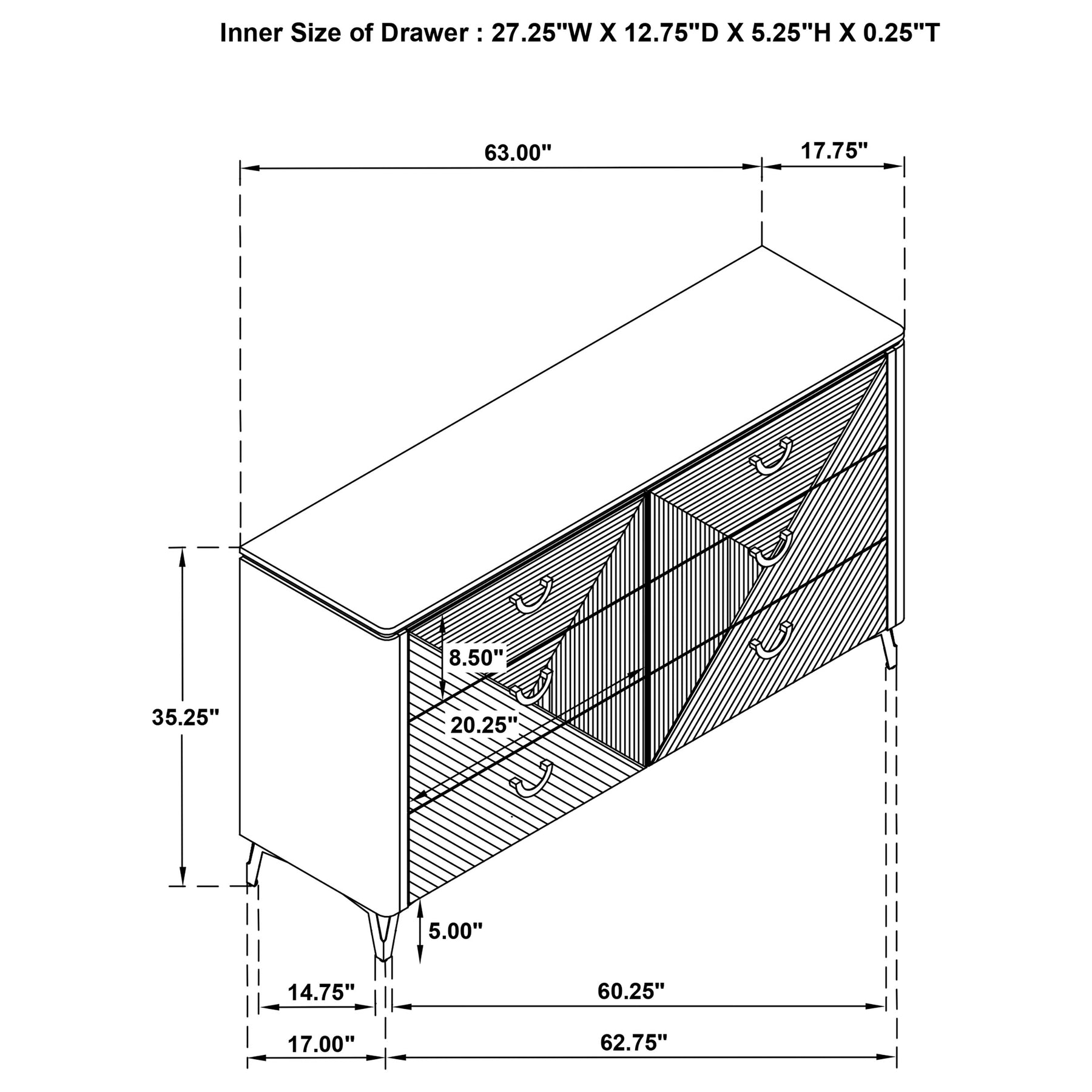 Crisp white high gloss and sculptural textures define this modern bedroom set, blending sleek surfaces with dimensional details. Geometric drawer fronts feature ribbed V-patterns and polished chrome pulls, while all drawers glide smoothly on 45mm metal extension hardware. The headboard stands out with chevron-tufted white faux leather framed by soft white LED trim. Completing the ensemble, a coordinating LED dresser mirror adds ambient glow and polished symmetry to the space. Elevated on chrome legs, this set is a showcase of contemporary form and function. Key Features: • White high gloss bedroom set with sculpted drawer fronts and chevron-tufted LED headboard • LED dresser mirror adds ambient lighting and visual symmetry to the modern design • All drawers include 45mm metal extension glides for smooth and reliable performance • Top drawers are fully lined in black felt to protect valuables and add elevated utility • Chrome U-shaped pulls and tapered acrylic legs provide sleek contrast and support • Crafted from engineered wood and faux leather for durability and shine