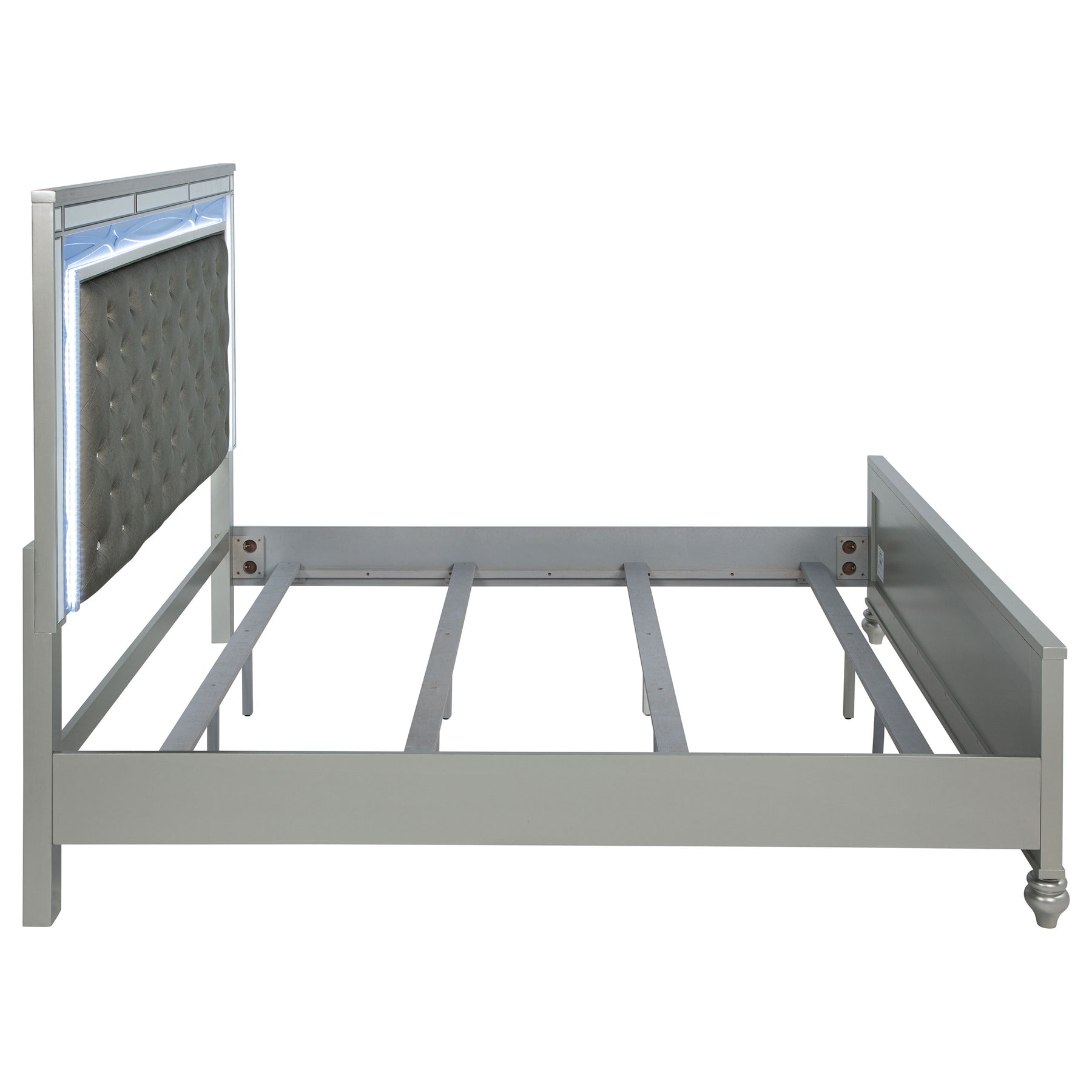 This glamorous contemporary bed features a variety of features that make it a must-have in any modern home. This exclusive Coaster design comes in a shimmering silver metallic finish that enlivens any space. The imposing headboard is upholstered with metallic leatherette that's fully tufted with crystal buttons. The headboard also includes white LED touch lighting so you can enjoy a vibrant ambiance. Solid block legs on the headboard and exquisite bun feet on the fret work detailed footboard come together to finalize the style of this fabulous bed. Key Features: • Panel bed with blue LED-lit headboard and tufted upholstered inset • Silver metallic finish accented with mirrored framing around headboard and footboard • Headboard features crystal-tufted metallic leatherette panel for a glam effect • Turned feet and solid block headboard posts offer balanced, elegant support • Requires foundation and is constructed with engineered wood and faux leather • Includes touch-activated lighting embedded in headboard for ambient effect