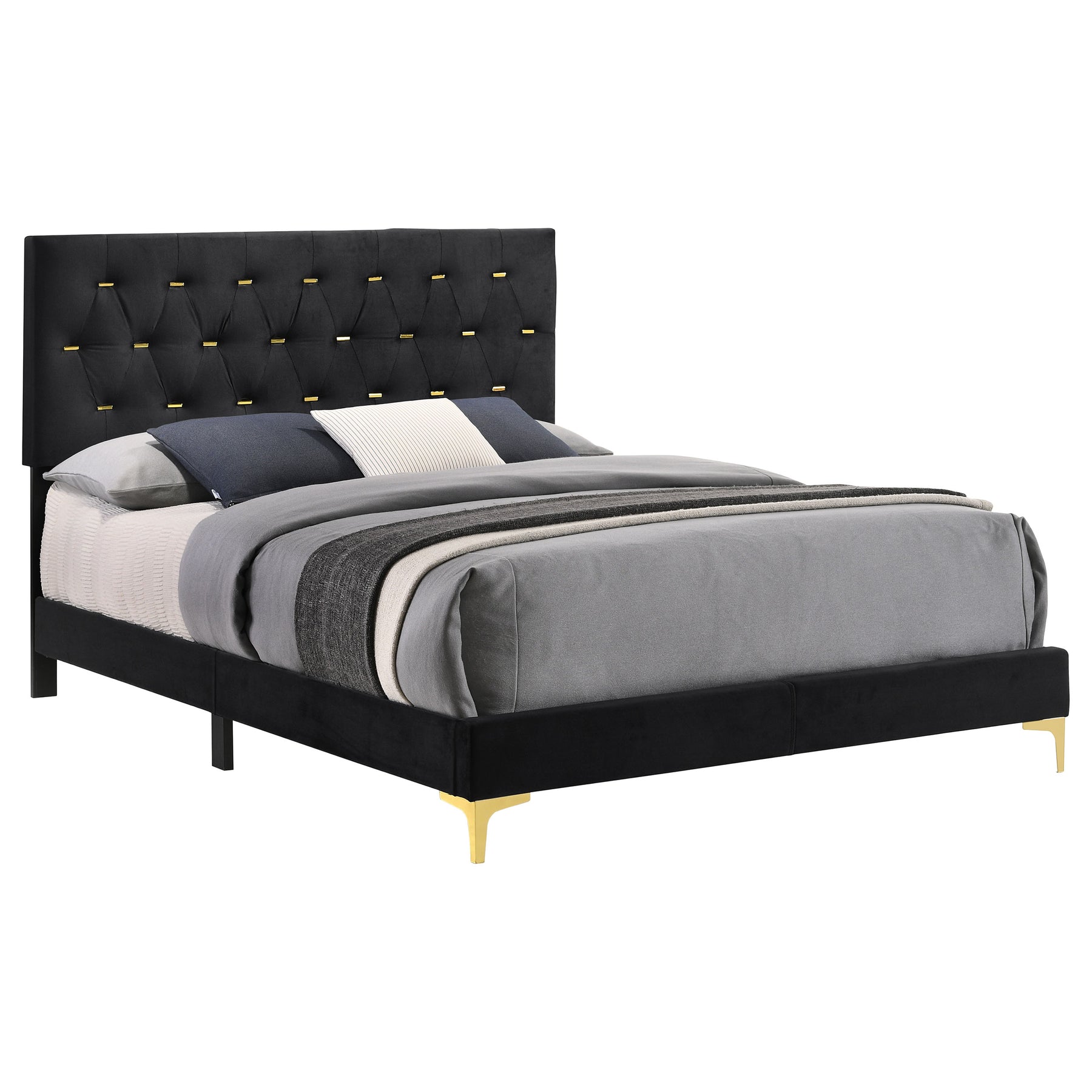 Create your glamorous bedroom retreat with this elegantly modern bed. A rectangular headboard with diamond button tufted details invites you to lean back and unwind each night. Shiny gold-finished bars accent the tufting, adding a sleek metallic touch. At the foot of the bed, gold bracket legs create a cohesive look. Wrapped in bright white leatherette, this bed offers a soft, supple feel for a luxurious finish. Key Features: • Perfect for contemporary and modern bedrooms • Clean styling with diamond shaped stitching and gold metal plates as decoration and golden legs • Upholstered in a bright, white leatherette for a soft texture throughout • Rectangular headboard with gold bar buttons creates a focal wall
