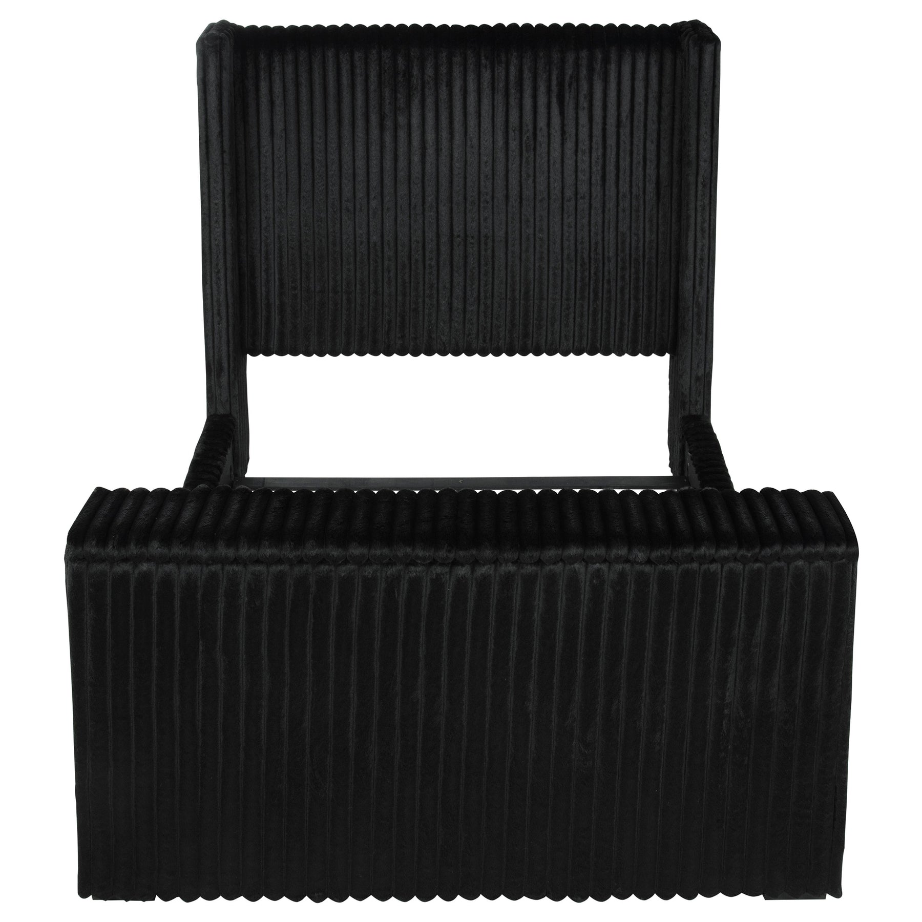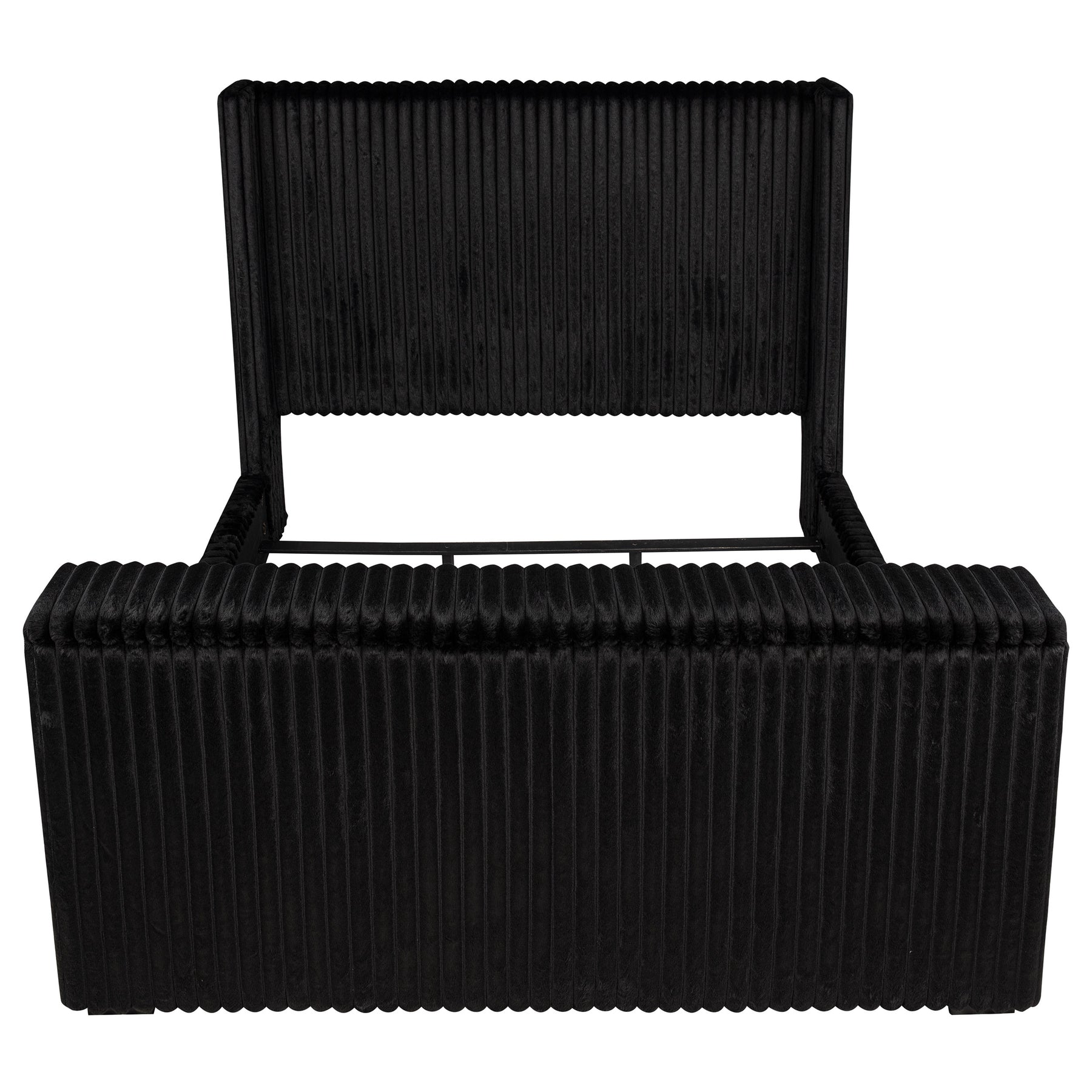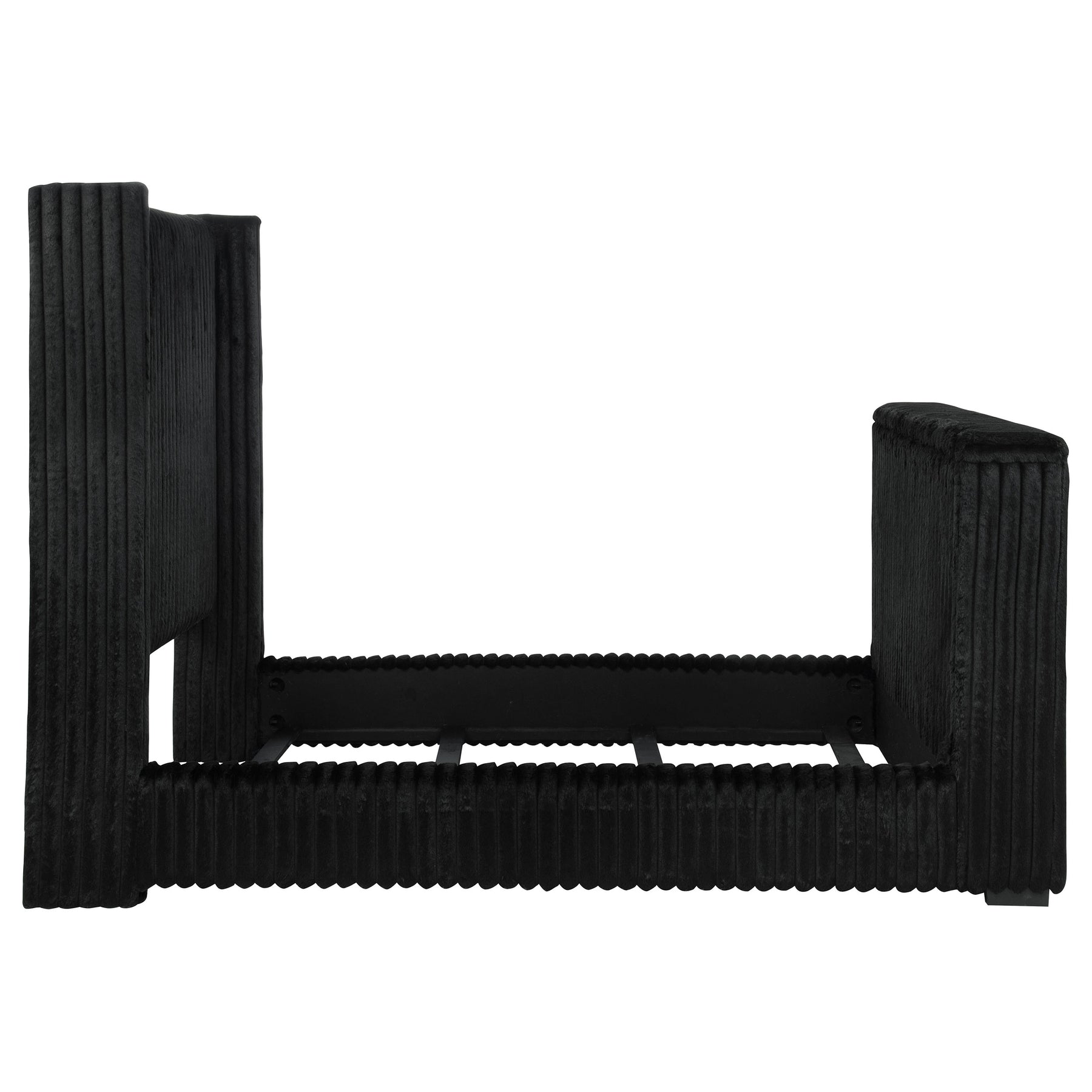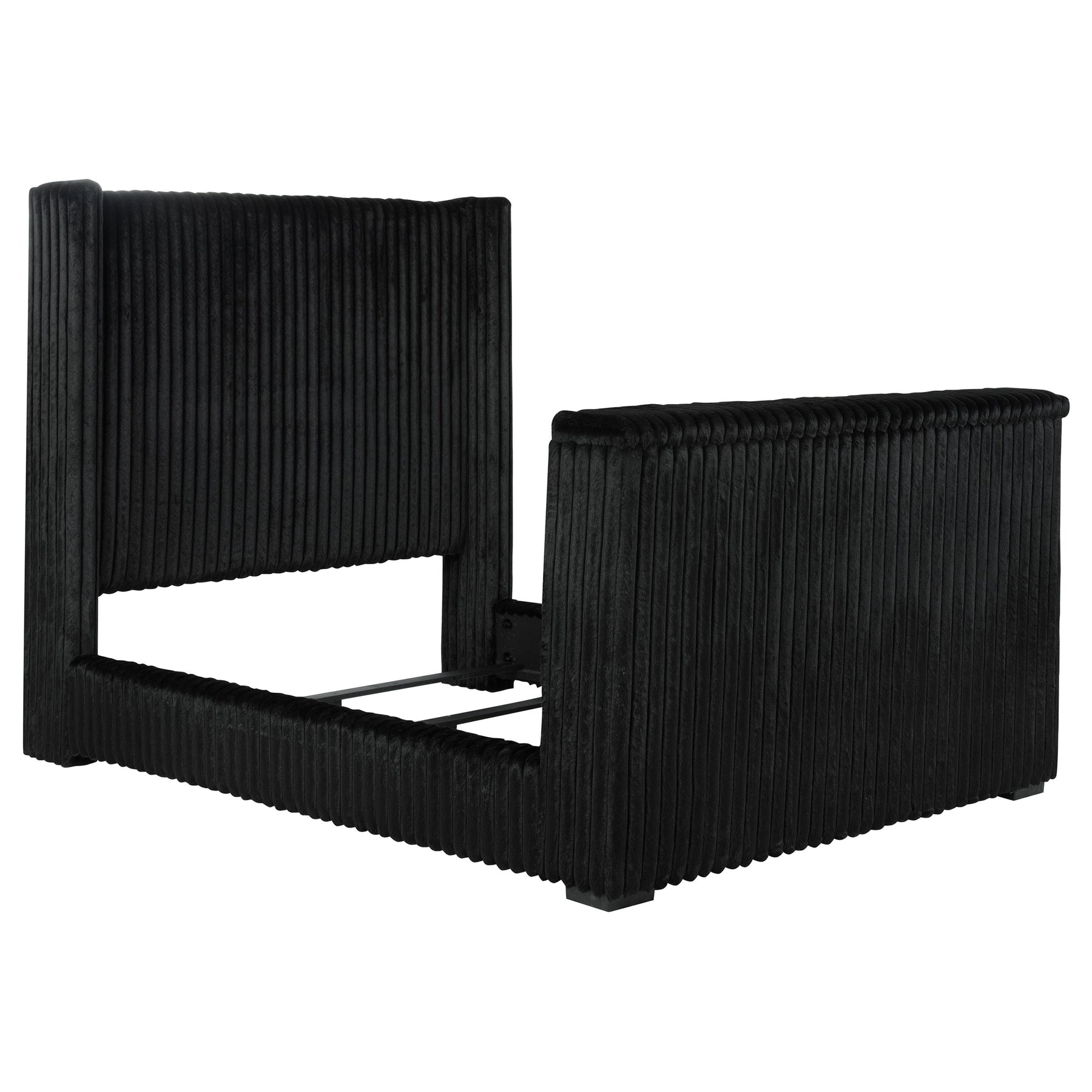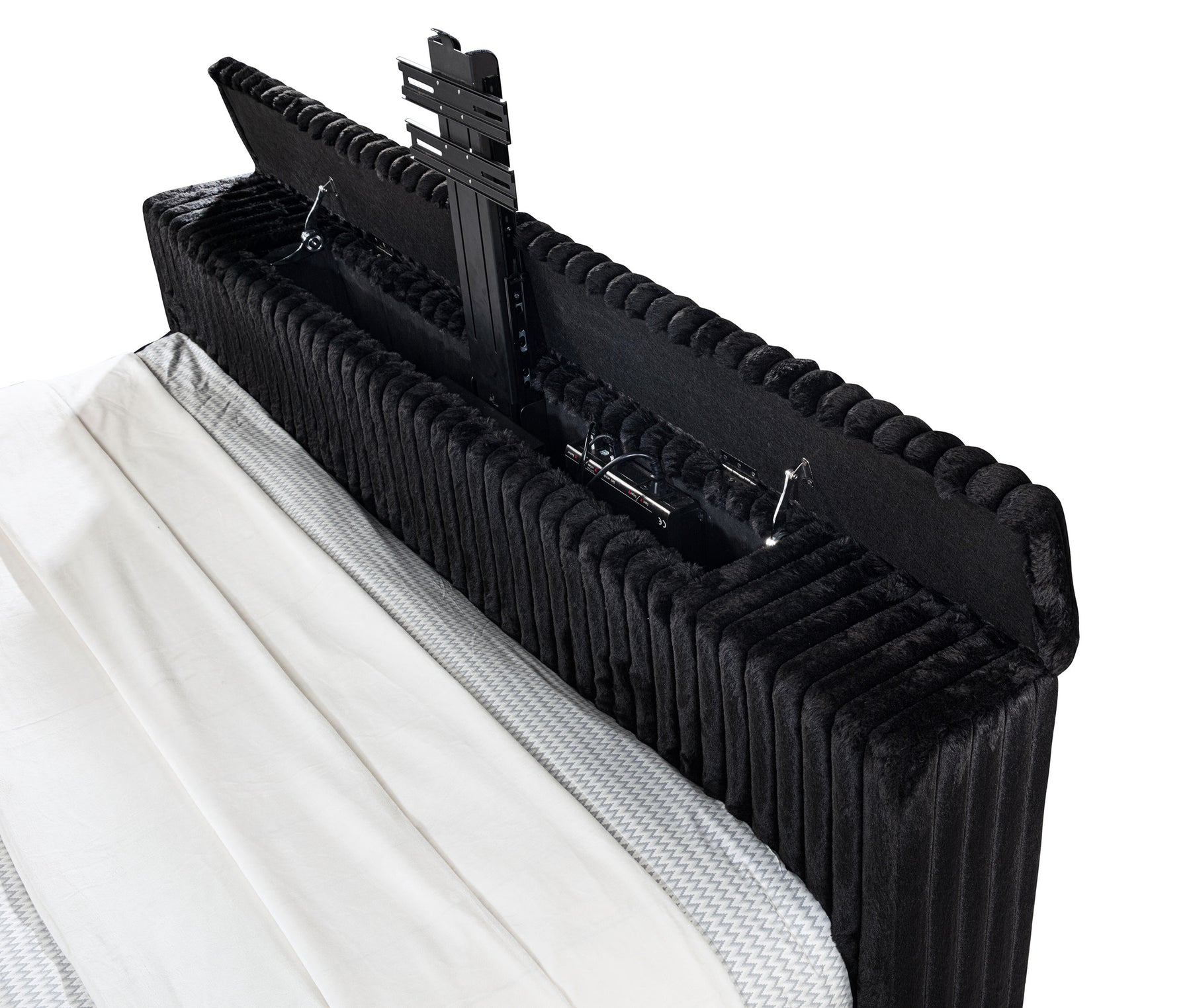 Unveil a new chapter of indulgence with this velvet wingback bed, where high style meets high tech. Richly upholstered in decadent black velvet, its vertical channeled frame embraces you in plush softness. Hidden within the footboard, a concealed TV lift fits up to 50-inch TVs and rises with the push of a button. A built-in power outlet with three AC ports adds plug-and-play convenience. This bed transforms any room into a sanctuary of luxury, beauty, and cinematic escape. Key Features: • Queen bed with tall wingback frame and vertical channel tufting in black velvet • Built-in TV lift mechanism accommodates TVs up to fifty inches in size • Three-outlet AC power strip hidden in footboard for seamless device connection • Plush velvet upholstery adds glam texture to the sculptural modern silhouette • Foam-padded and fully upholstered for comfort and a clean, finished look • Crafted from birch, engineered wood, and plywood for durability and support