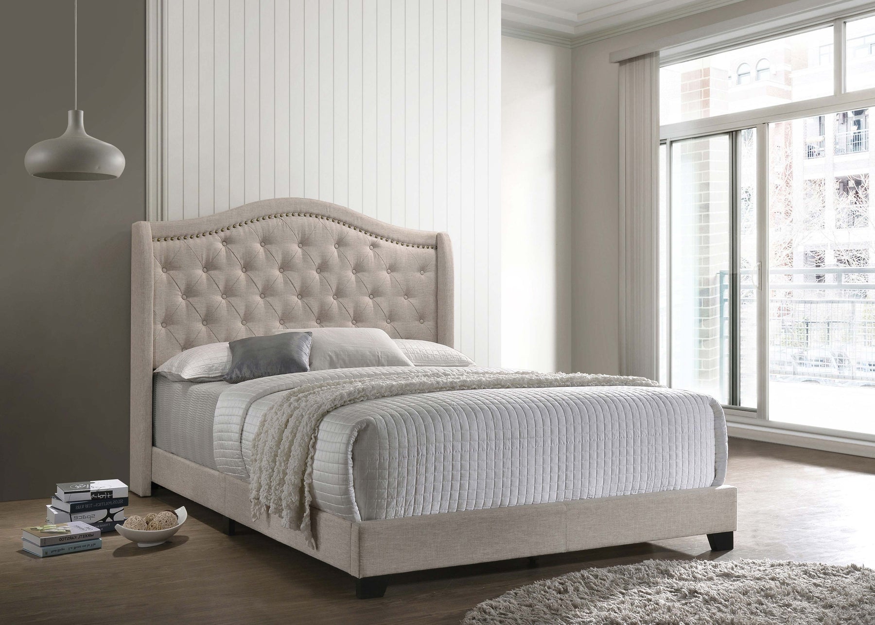 A tall and imposing headboard ups the drama factor for this Sonoma upholstered bed. Beautiful linen-like fabric wraps the headboard, rails, and low-profile foot rail to create a composed look. The headboard features a camelback profile that softens its silhouette. Button tufting is presented in multiple horizontal rows, adding texture and depth. Nailhead trim is a wonderful, classic finishing touch. Key Features: • Demi-wing upholstered bed in grey fabric • Camel back headboard with button tufting • Individually driven chrome nailhead trim • Plywood and MDF frame • Box spring required • Available in grey, beige, and blue fabric