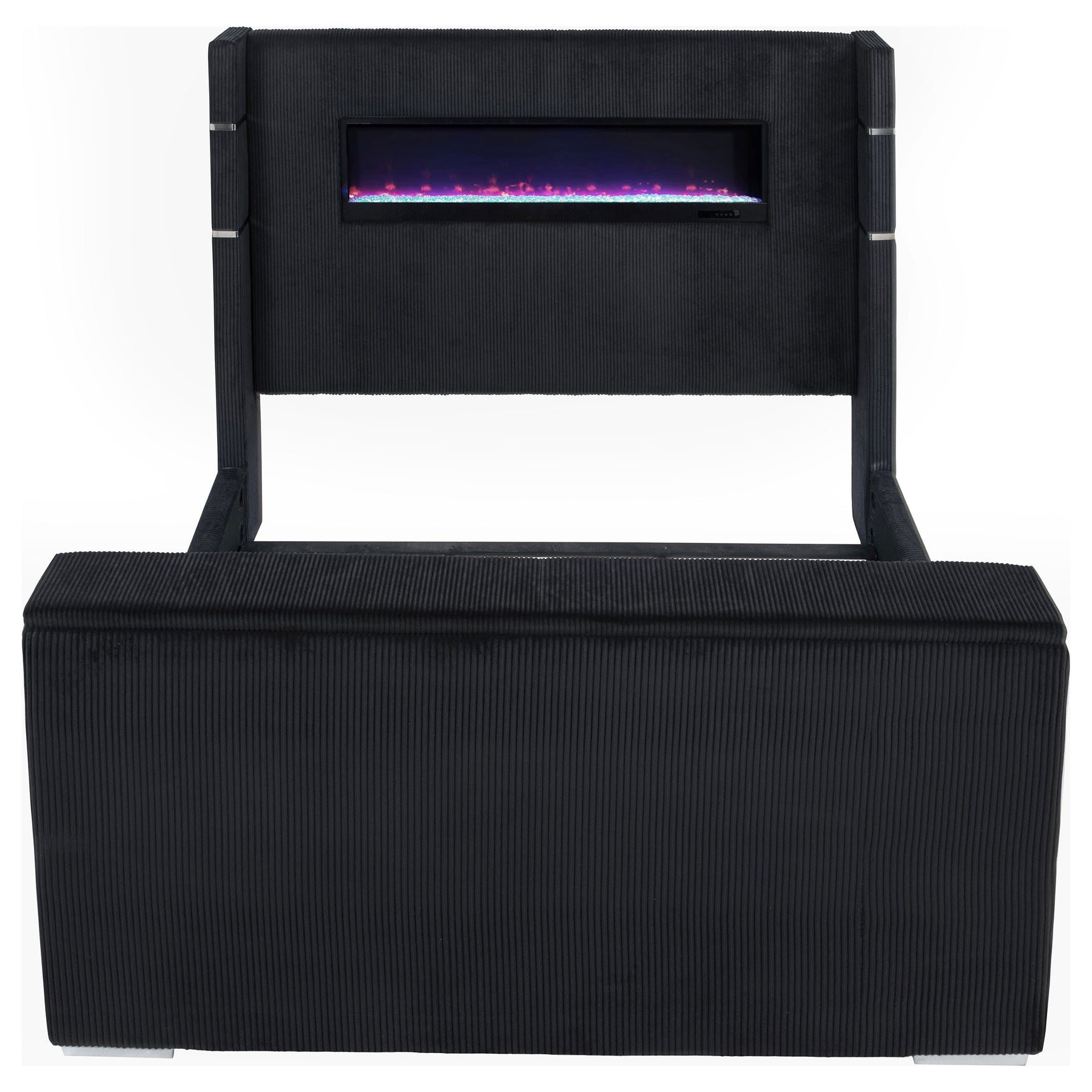 This innovative wingback bed levels up a top-selling design with bold tech upgrades and plush texture. A hidden motorized TV mount rises from the footboard via remote control, supporting screens up to 50 inches and tucking neatly away when not in use. The headboard’s flame visualizer glows over shimmering crystal rocks with sixteen color settings. Dual USB-A and USB-C ports on each side keep devices powered. Upholstered in soft, faux fur-style corduroy over a solid pine frame. Key Features: • Queen wingback bed upgraded with motorized TV lift in footboard and remote-controlled flame box • Plush black faux fur-like corduroy fabric delivers striking, tactile softness and bold style • Hidden footboard TV rack accommodates up to fifty-inch flat screens with smooth lift • Headboard includes crystal flame visualizer with sixteen color options and no heat output • Dual USB-A and USB-C ports on each side of headboard provide fast, convenient charging • Solid pine frame and seven-foot electrical cord ensure reliable structure and easy power access
