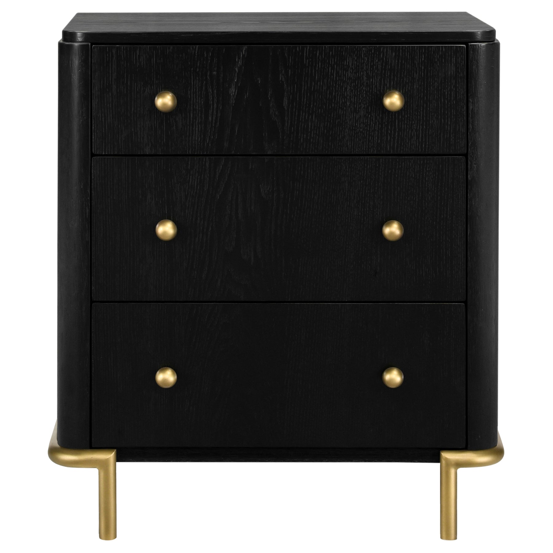 Retro charm meets modern function in this three-drawer nightstand, featuring a warm sand wash finish with subtle wire-brushed texture. Round aged brass knobs and matching tubular metal legs add a hint of glamour, while a built-in dual USB port offers convenient bedside charging. The top felt-lined drawer keeps delicate items safe, blending timeless mid-century aesthetics with everyday practicality for a refined and functional bedroom accent._x005F_x000D_ Key Features: • Three-drawer nightstand with soft sand wash wire-brushed finish • Aged brass knobs and metal legs enhance its mid-century appeal • Top drawer lined with felt to protect delicate items • Built-in dual USB ports for convenient bedside charging • Crafted from rubberwood, engineered wood, and ash veneer • Elegant rounded corners and tubular legs add modern balance