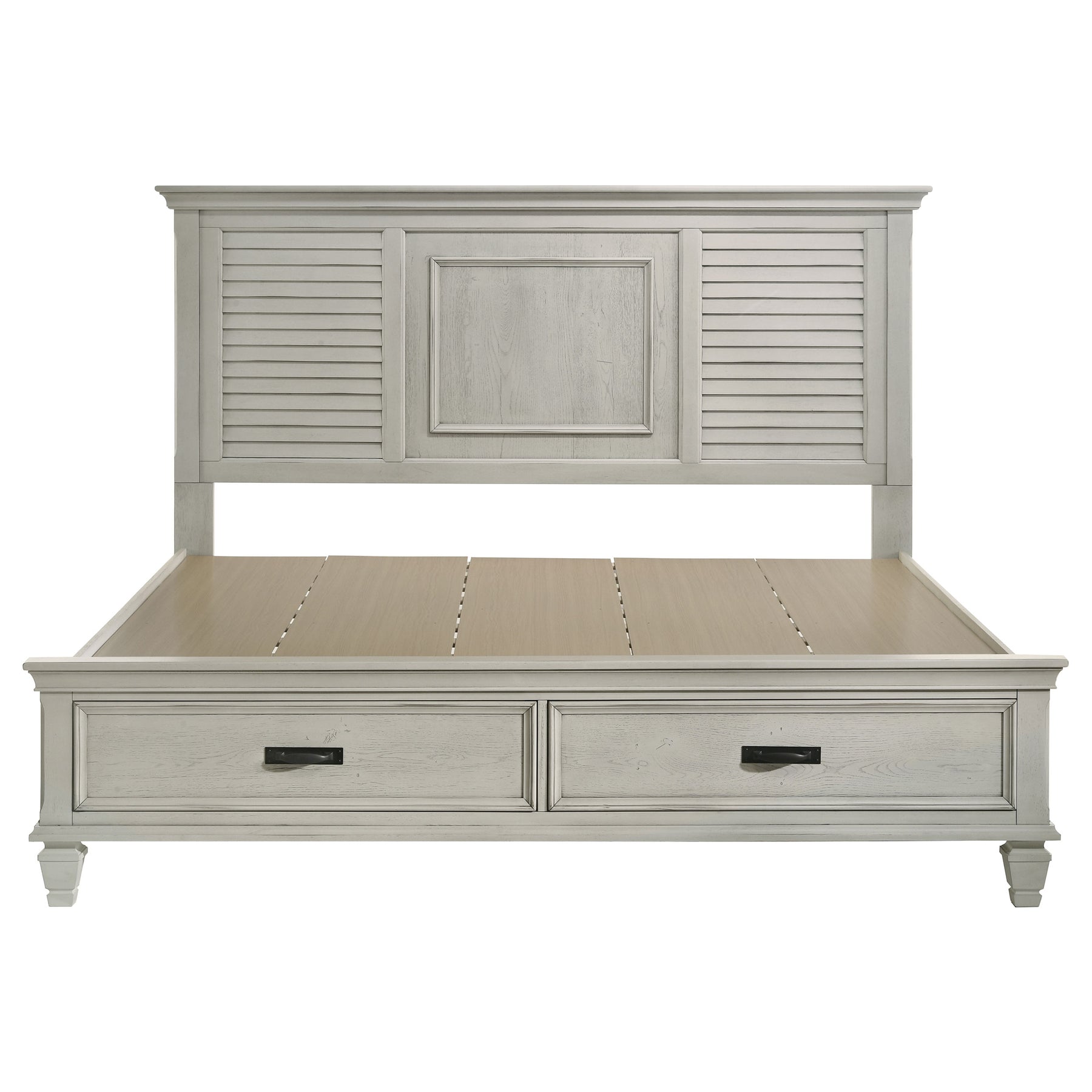 With a casual, rustic vibe perfect for a beachside cottage, this platform bed features a shutter style paneled headboard that lends a tropical design. The bed frame also boasts a subtle wire-brushed finish with molding accents. The footboard offers two spacious drawers, each with soft-closing drawer glides and dark finished hardware. In addition, this lovely bed frame is slightly raised on square carved, tapered feet. Available in three finishes, this bed is sure to fit in your bedroom's existing color palette. Key Features: • Spend every day in a coastal resort paradise with the Franco collection • Warm painted finish with antique white accents and wire-brushed white oak veneer • Bed has platform system that will accommodate most mattress types and warranties including memory foam • Soft-closing drawer glide