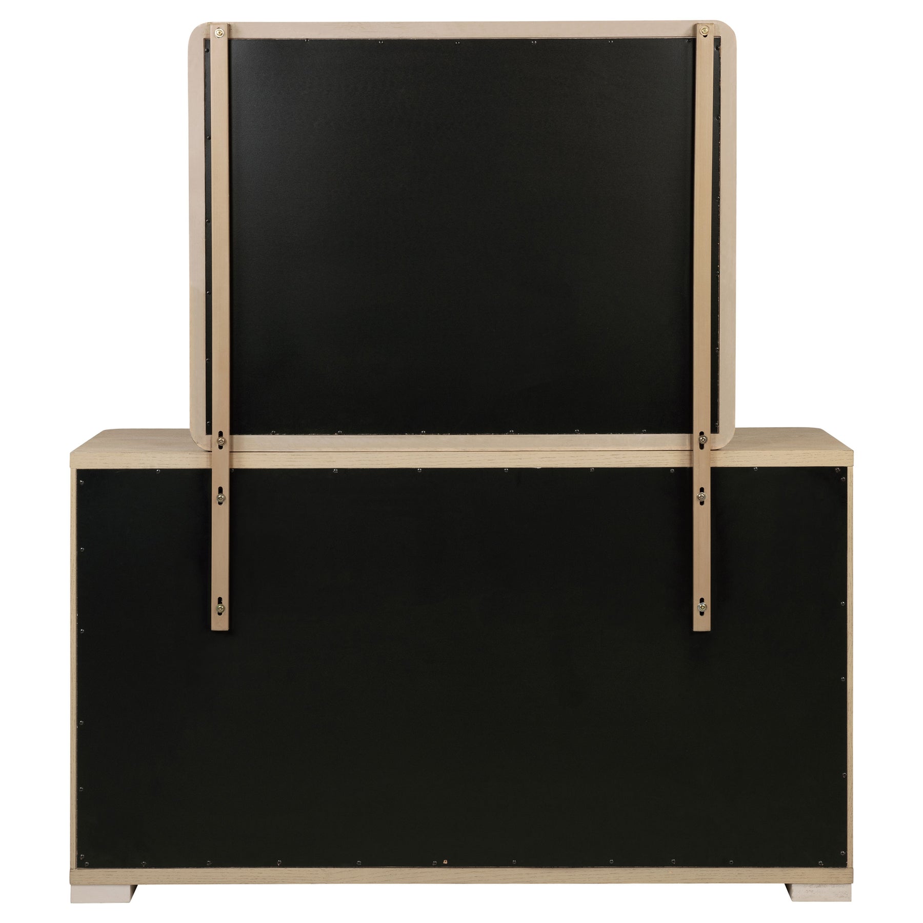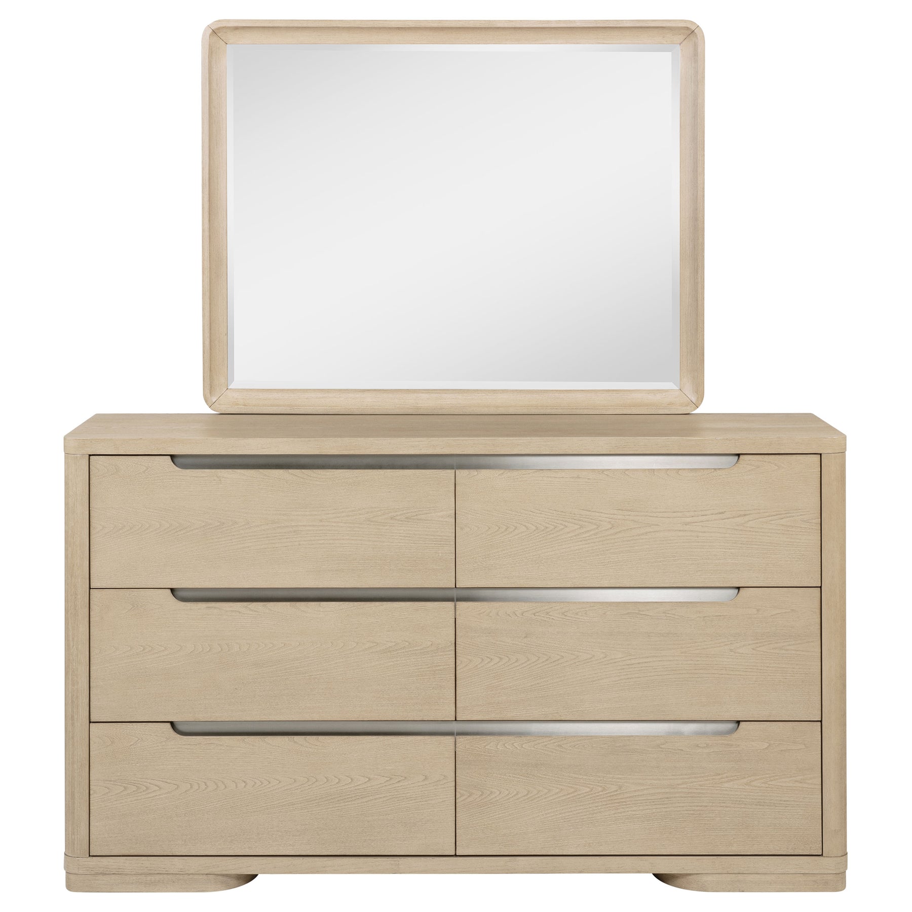 The dresser and mirror set combines function and elegance with its light elm finish and sleek contemporary design. The dresser features six extra-large tinted drawers, each crafted with French and English dovetail construction for durability. Brushed nickel fingertip pulls and rounded corners add refinement, while the matching rectangular mirror completes the look with its clean lines and softly rounded edges, creating a cohesive, modern bedroom ensemble. Key Features: • Light elm finish creates a modern, elegant aesthetic for the dresser and mirror set • Six tinted, extra-large drawers offer ample storage for clothing and personal items • French dovetail fronts and English dovetail backs ensure durable drawer construction • Brushed nickel fingertip pulls provide a refined accent to the contemporary design • Rectangular mirror with matching light elm frame and rounded edges completes the set • Durable construction and stylish design make this set a perfect fit for any bedroom