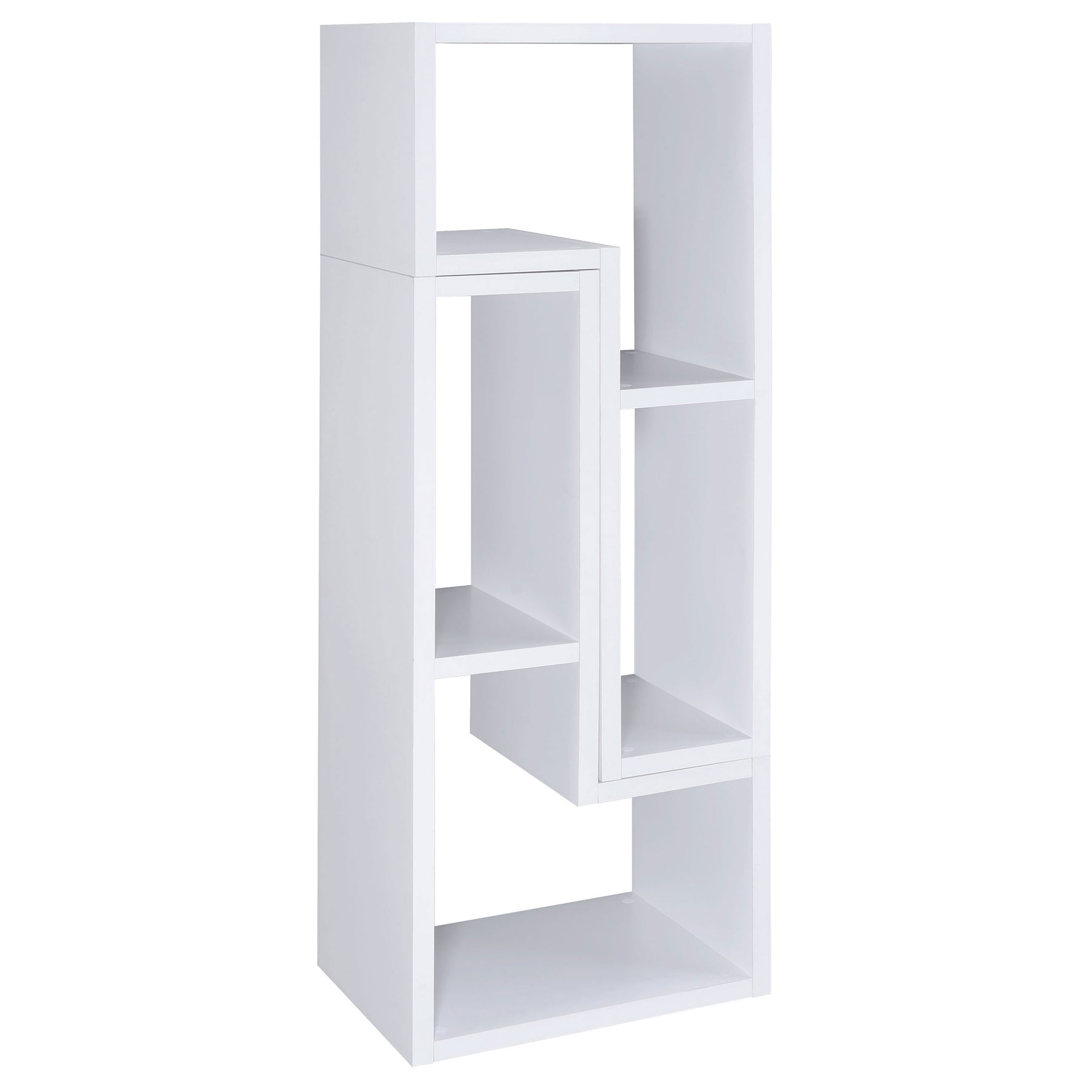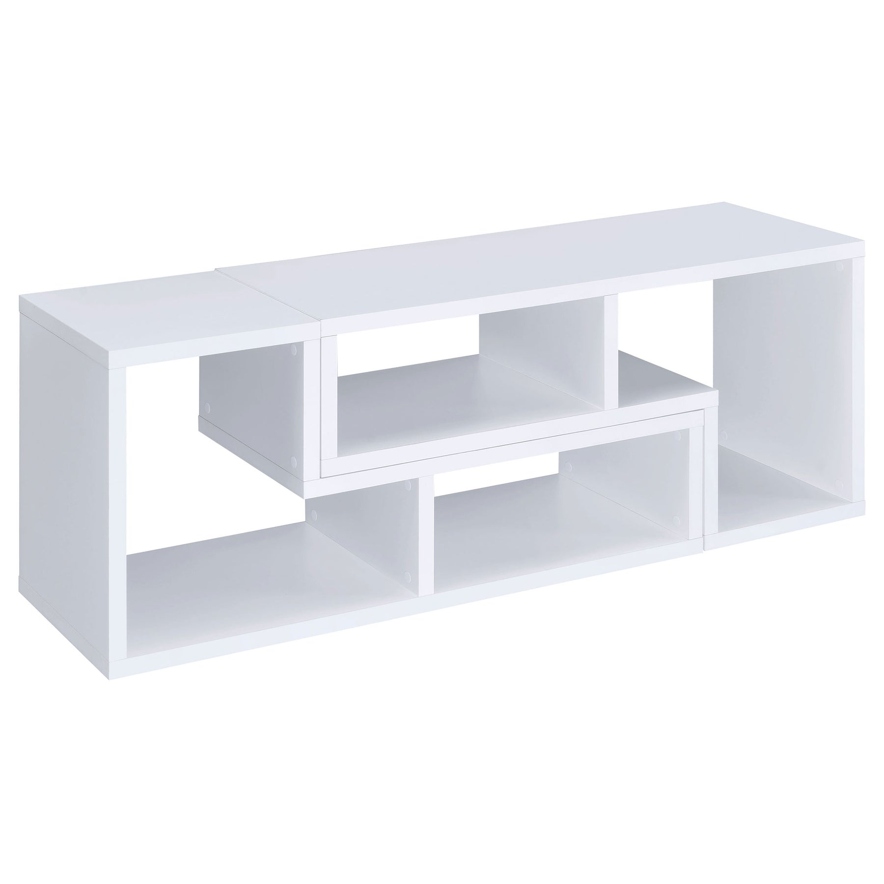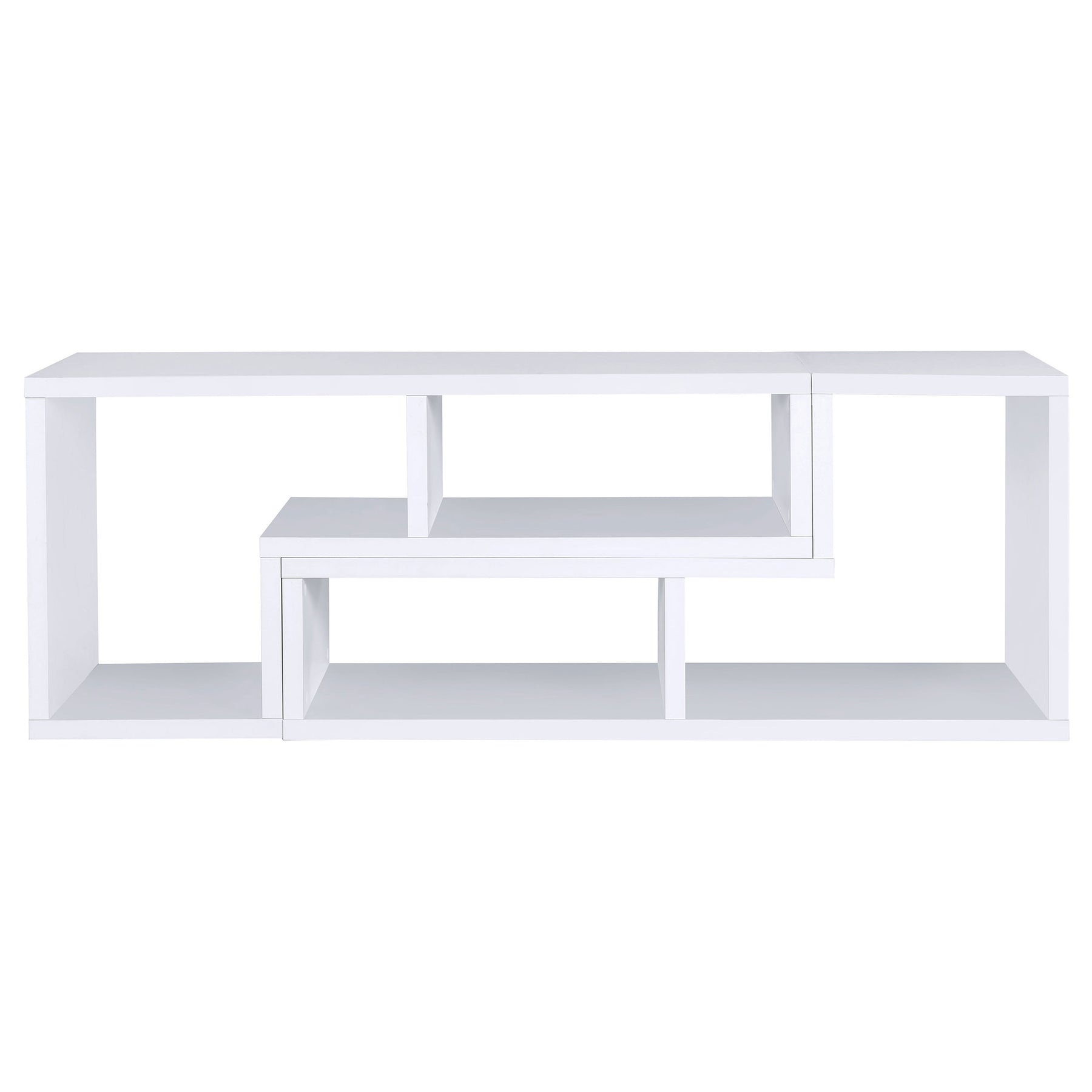 Perfect for a variety of uses, this two-piece bookcase and TV console is fabulously versatile. It allows you to switch between various bookcase and TV stand configurations for your convenience. Bold, L-shaped shelves are arranged in striking geometric designs for a modern look. A white finish enhances its contemporary appeal. Crafted from top quality materials, this bookcase is sturdy, stylish, and smart. Key Features: • An asymmetrical arrangement of shelves creates an intriguing silhouette while offering ample storage space • Two-piece bookcase with an attractive L-shape design • Constructed with MDF, particle board, and laminate • Versatile design allows you to switch between various bookcase and TV stand configuration • Available in cappuccino, white, and grey driftwood