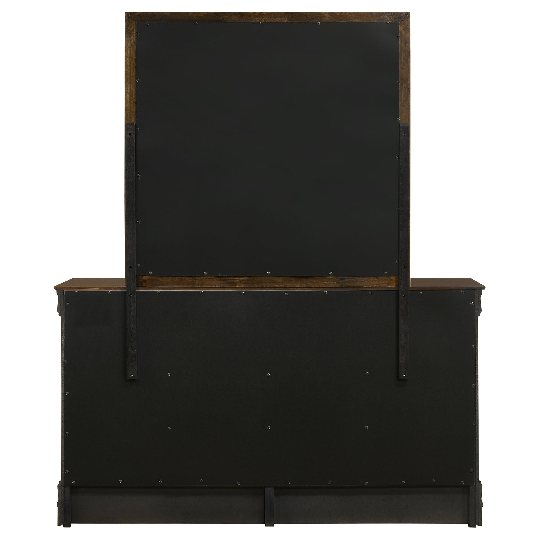 Enhance your traditional decor with this polished six-drawer dresser, showcasing simple and elongated details in a warm cappuccino finish. The contrast between the deep wood hue and nickel bail drawer handles radiates classic style and sophistication, while the exposed wood grain adds extra dimension. Crafted from wood veneer and select hardwoods, this dresser features dovetail drawer construction for stylish and durable storage. Complement it with the sleek rectangular mirror, its thin clean lines and cappuccino finish adding depth and balance to your bedroom, refining the space with its charming wood veneer and select hardwood construction. Key Features: • Six-drawer dresser with elongated details in warm cappuccino finish • Exposed wood grain for added dimension and classic appeal • Nickel bail drawer handles contrasting with deep wood hue • Crafted from wood veneer and select hardwoods for durability • Sleek rectangular mirror with thin lines and cappuccino finish