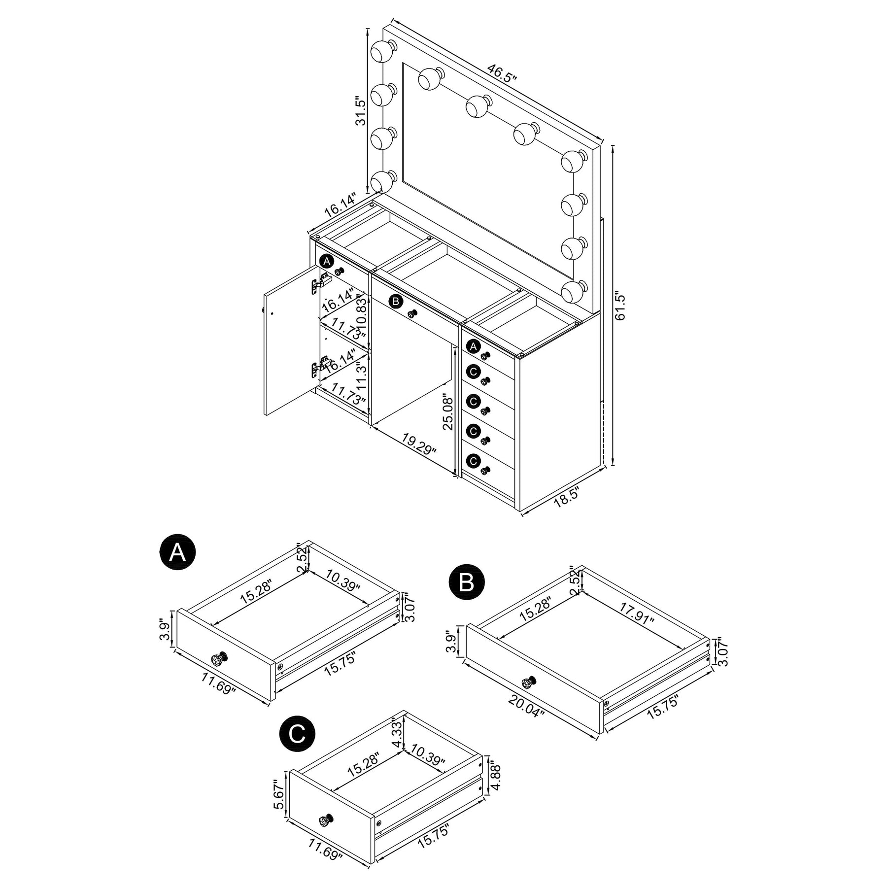 Boasting a Hollywood regency flair, this vanity offers a bold, clean-lined aesthetic for a contemporary home as it shows off a white finish throughout that opens itself up to your existing color palette. Keep all of your cosmetics and beauty products organized within the seven spacious drawers, displaying special items in the top three. Above the top row of drawers is a clear tempered glass top that showcases everything beneath. Each drawer is also adorned with a glimmering crystal-like acrylic knob. Lastly, the oversized vanity mirror offers all the glow you need, complete with eleven globe-style bulbs that lend a vintage vibe. Key Features: • The epitome of Hollywood glam, this vanity will be the perfect upgrade for any home • Modern white finish matched fantastically with crystal knobs • Features seven drawers with full extension glides and a storage cabinet with an adjustable shelf • Clear tempered glass top allowing you to showcase your accessories • Mirror features eleven light sockets for a superior all-around even lighting (light bulbs included) • Constructed with MDF, particle board, glass, and engineered laminate