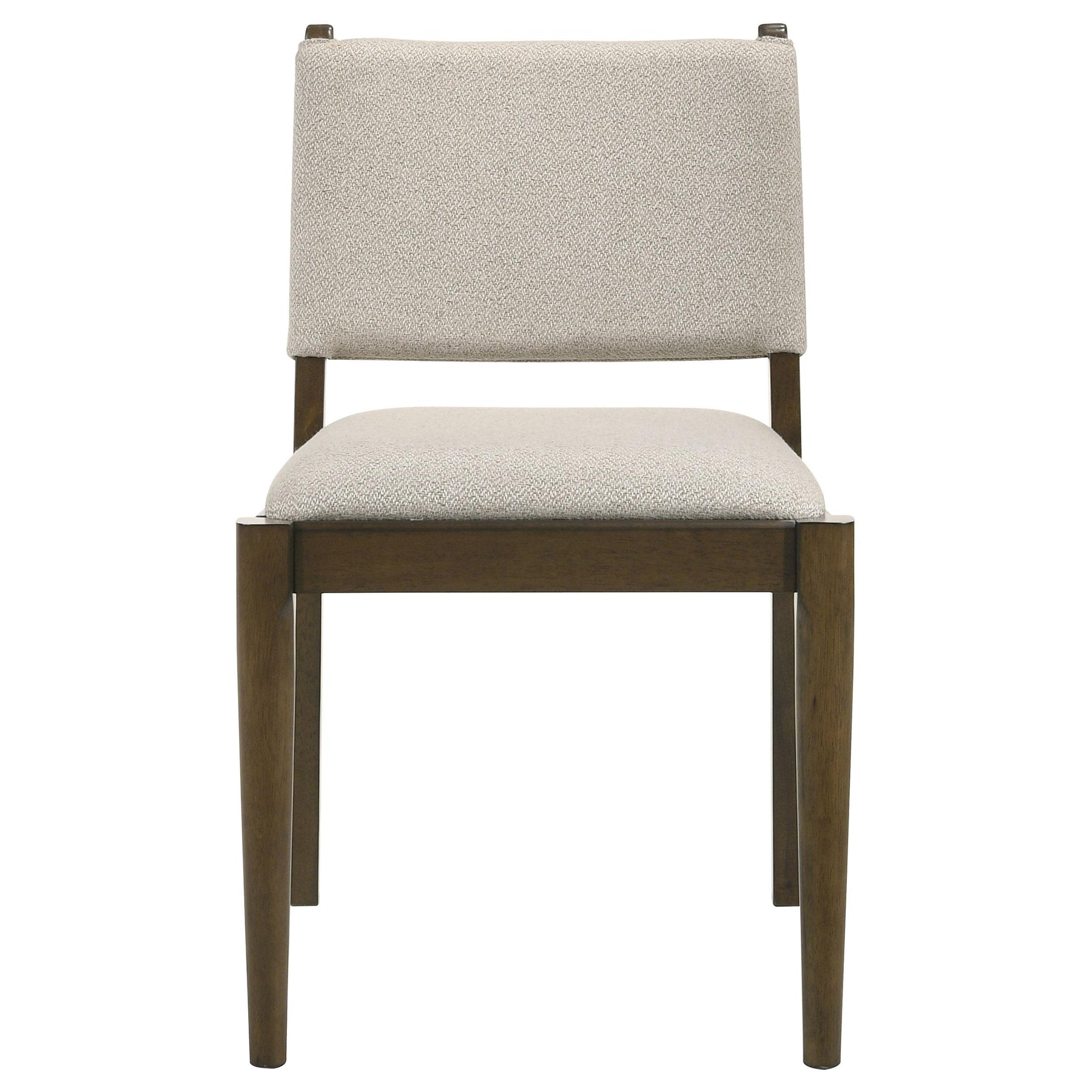 This stylish dining chair merges modern design with elegant craftsmanship. Featuring a wrapped backrest accented by unique brown tie detailing on the back, it adds a sophisticated touch to your dining space. Upholstered in soft light tan fabric, the chair provides comfortable seating with foam-padded support. The tapered legs in a rich brown wood finish complement the overall design, ensuring both durability and charm. Perfect for transitional or contemporary dining areas. Key Features: • Wrapped backrest with unique brown tie accents for a sophisticated touch • Upholstered in light tan fabric for a soft, versatile, and modern look • Foam-padded seat and backrest ensure comfort for extended dining experiences • Tapered legs in a brown wood finish add durability and a timeless aesthetic • Distinctive back detailing enhances the visual appeal of the chair from all angles • Built with rubberwood, engineered wood, fabric, and foam for long-lasting quality
