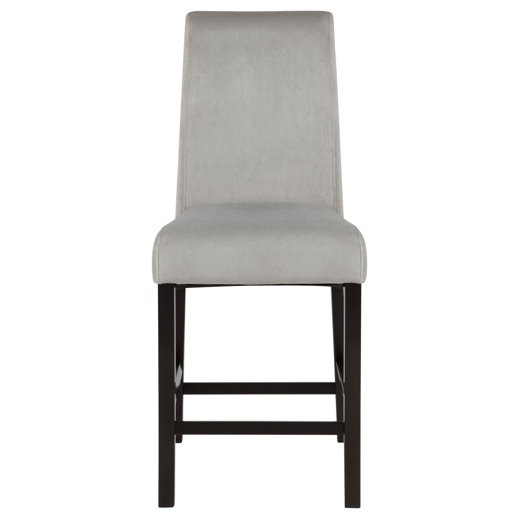 Express modern simplicity with the neutral tones from this five-piece dining set. Constructed of ash veneers, the table and four side chairs feature a rich black finish. Sleek and clean, the open base of the chairs are complete with built-in foot rests and a softly upholstered seat and back. Go all-in on a contemporary casual dining room theme, or add a sophisticated feel to a laid-back entertainment room. The geometric base is elevated with a subtle wave design to enhance visual intrigue. Key Features: • Square counter height dining table set with geometric stacked pedestal base for modern appeal • Black wood finish complements the bold silhouette and oak veneer table surface • Grey velvet chairs feature full backrests and cushioned seats for elevated comfort • Built-in footrests offer support while seated, enhancing everyday dining usability • Constructed from solid rubberwood, engineered wood, oak veneer, and velvet • Assembly required with minimalist lines and refined textures suited for casual spaces