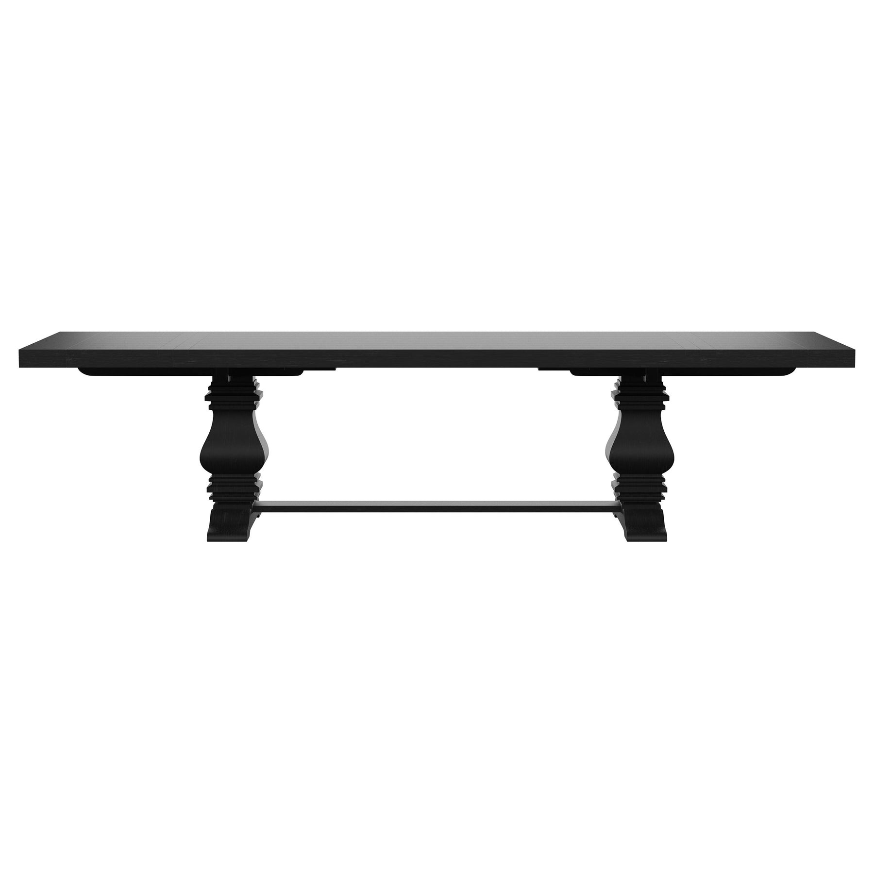 This rectangular extension dining table blends classic European elegance with artisan craftsmanship. Crafted from solid pine, it features a double pedestal trestle base that exudes romantic charm and timeless character. The sculpted pedestals, connected by a wide plank accent, create a striking focal point with an authentic handcrafted feel. A planked tabletop enhances its rustic appeal, while two 16-inch removable leaves extend the table up to 126 inches, making it perfect for gatherings large and small. Built for both beauty and durability, this table is an inviting centerpiece for any dining space. Key Features: • Rectangular dining table with a sculpted double pedestal trestle base • Crafted from 100% solid pine for strength and long-lasting durability • Two 16-inch removable leaves extend the table up to 126 inches • Wide plank accent between pedestals adds an artisan, handcrafted feel • Planked tabletop highlights natural wood grain with a rustic honey finish • Romantic farmhouse style complements traditional and casual interiors