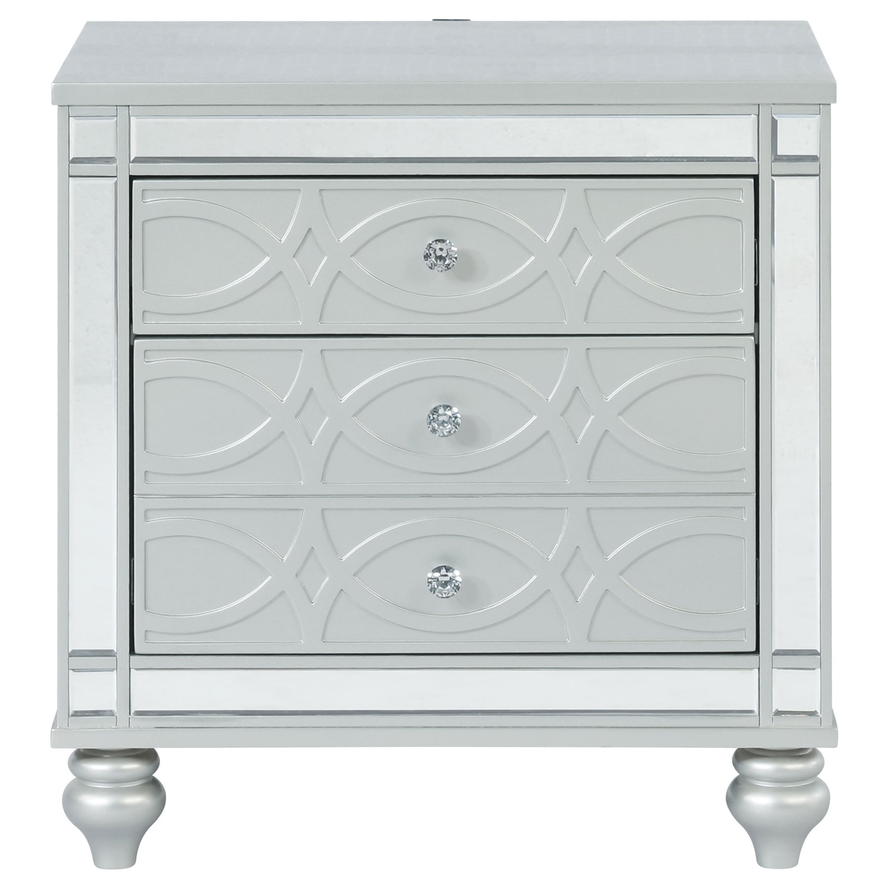 Bring modern glam to a classic design with this transitional two-drawer nightstand. It features a glitzy design that draws the eye in any modern home. It's crafted with a vibrant silver metallic finish with fret work detail on the front panels and drawer fronts. The drawers are adorned with crystal-like pulls and the top one is lined with black felt. Dual USB ports and delicate bun feet complete the design of this exquisite accent piece. Key Features: • Two-drawer nightstand with silver metallic finish and mirrored trim accents • Front panels feature fretwork detail with crystal-like knobs on each drawer • Top drawer is felt-lined and includes dual USB charging ports for convenience • Clear sealer drawer boxes glide smoothly for accessible bedside storage • Stands on delicately shaped bun feet to elevate the refined design • Constructed from engineered wood, mirrored accents, and polyresin trim