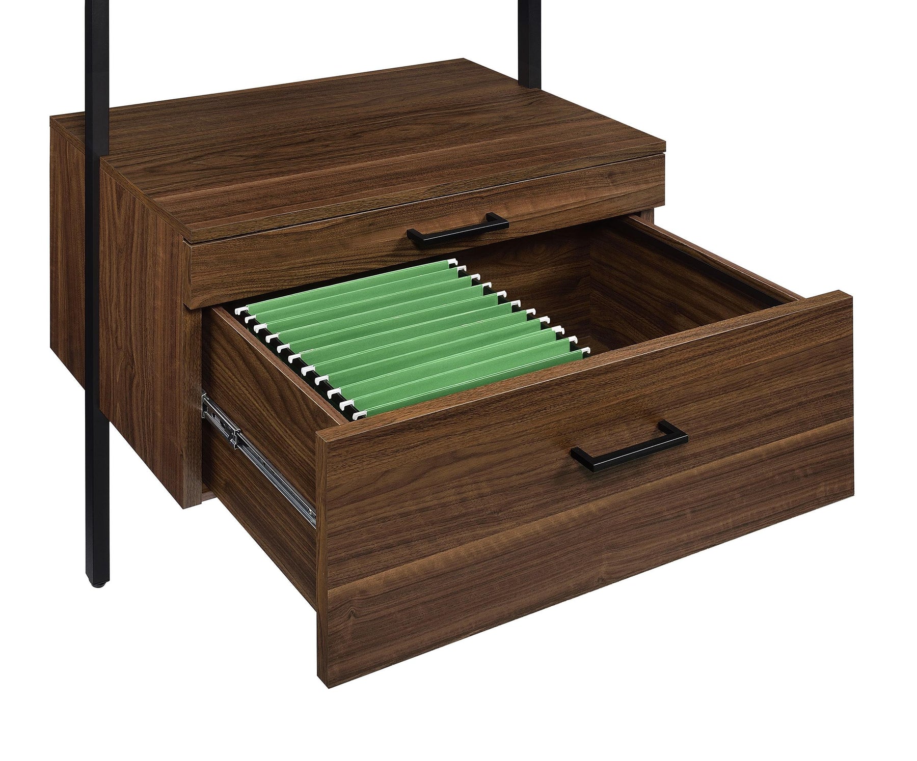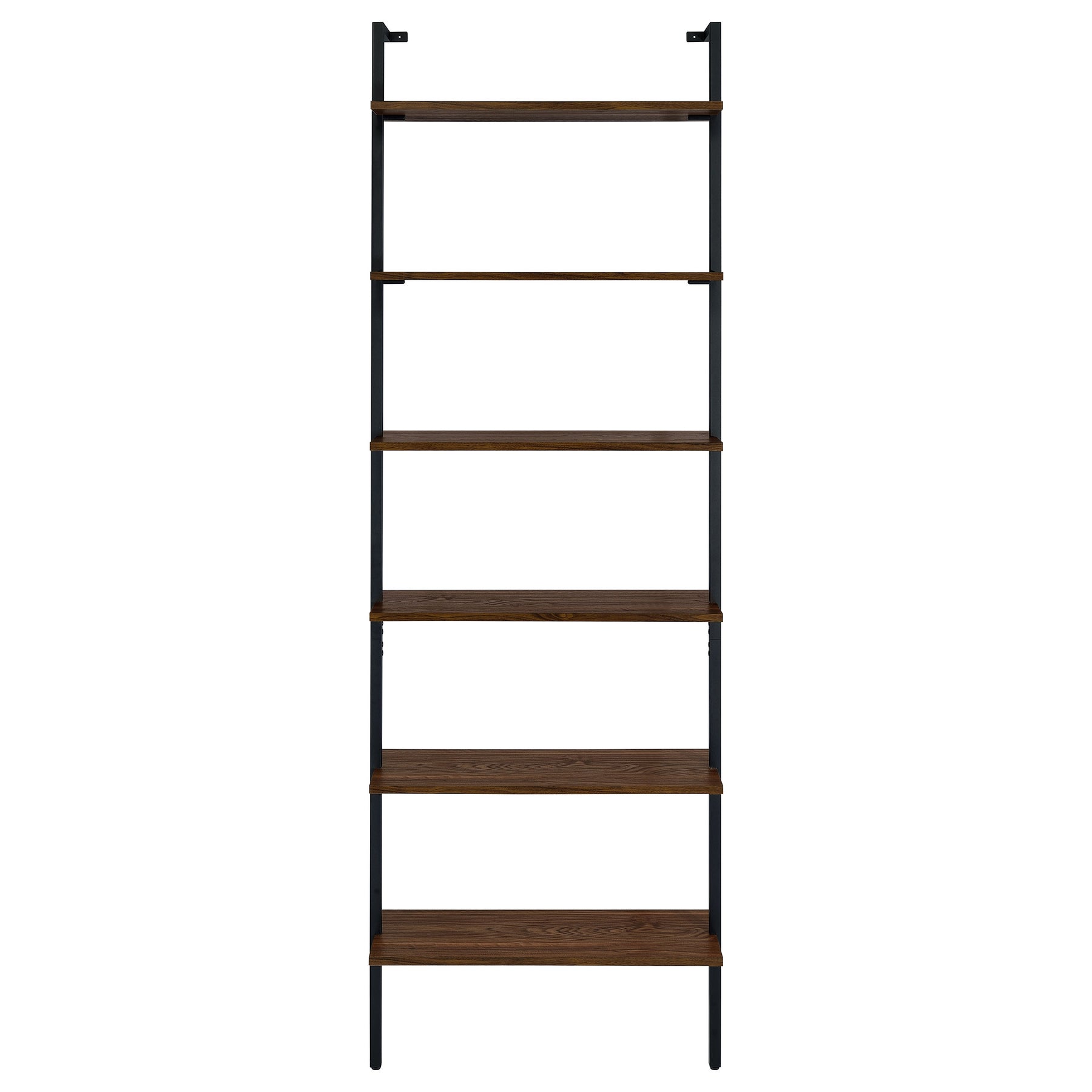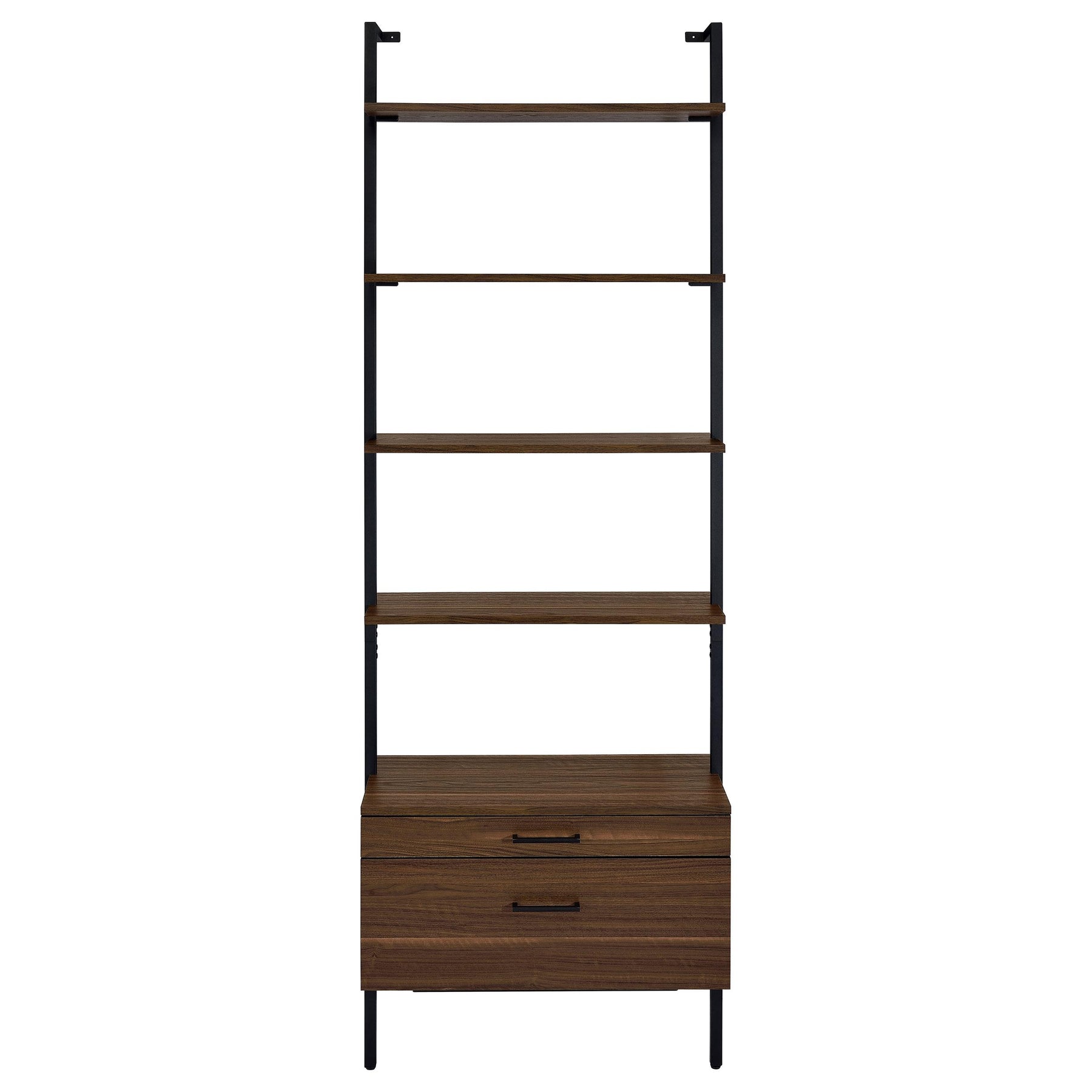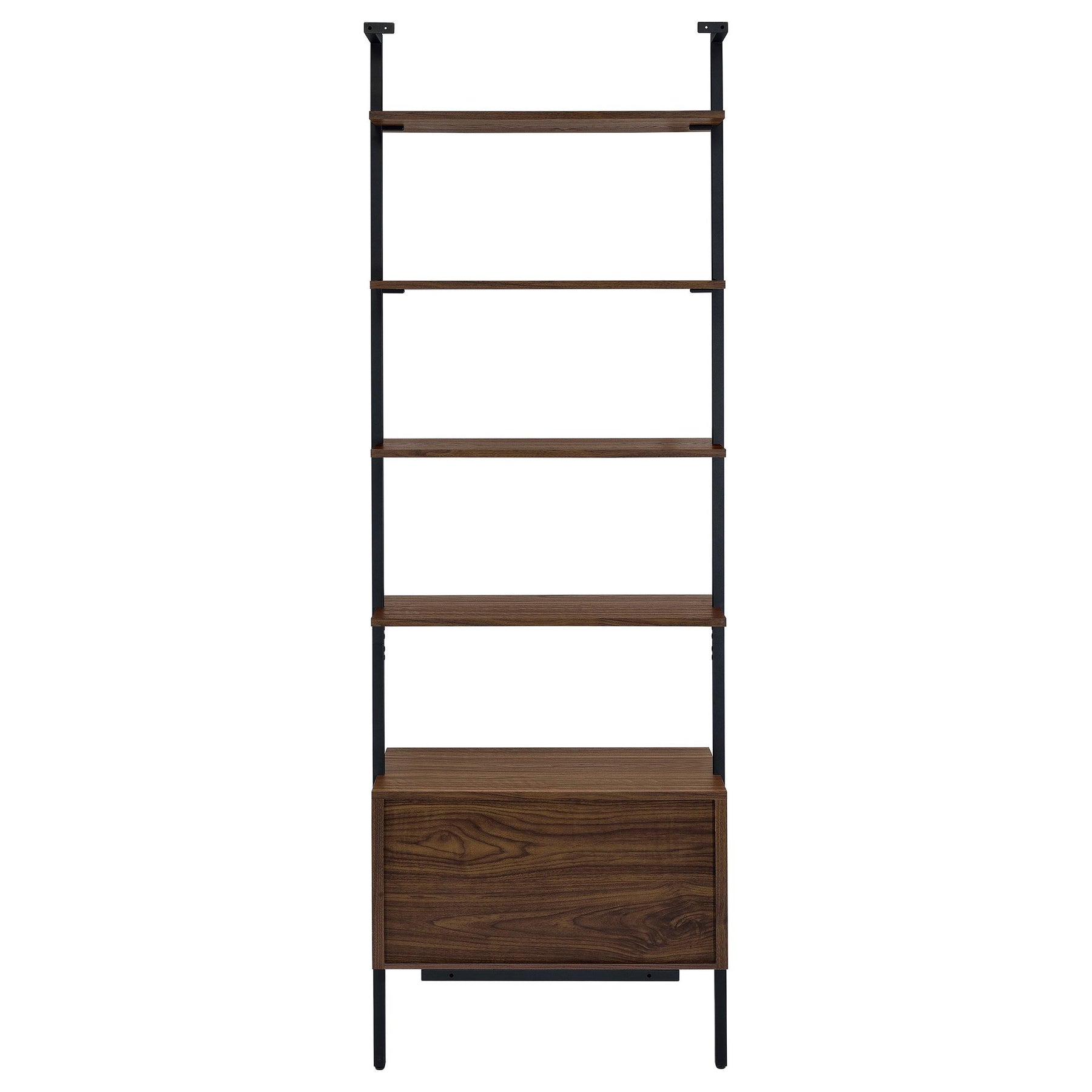 Play up the light, airy ambiance of a modern space while making use of every inch with a modern wall bookcase. It features four floating upper shelves and a lower case with two drawers, perfect for a blend of storage and display in any room. The shelves and two drawers feature a warm walnut finish over melamine paper, offering durability for a lovely look that lasts. A black finish metal frame supports the bookcase, offering neutral appeal in any setting. Stash essentials in the drawers while adding decor to shelves for a personal look and feel. Key Features: • Achieve a minimalist look with the open, airy style of a modern four-shelf wall bookcase • Features four floating shelves and two drawers for a light, refined look in your bedroom or den • Shelves and drawers feature a deep walnut wood finish over melamine paper that's durable and stylish • Metal frame features clean, straight lines and a rich black finish for neutral appeal • Adds storage and maximizes space beside an entertainment center or in a home office