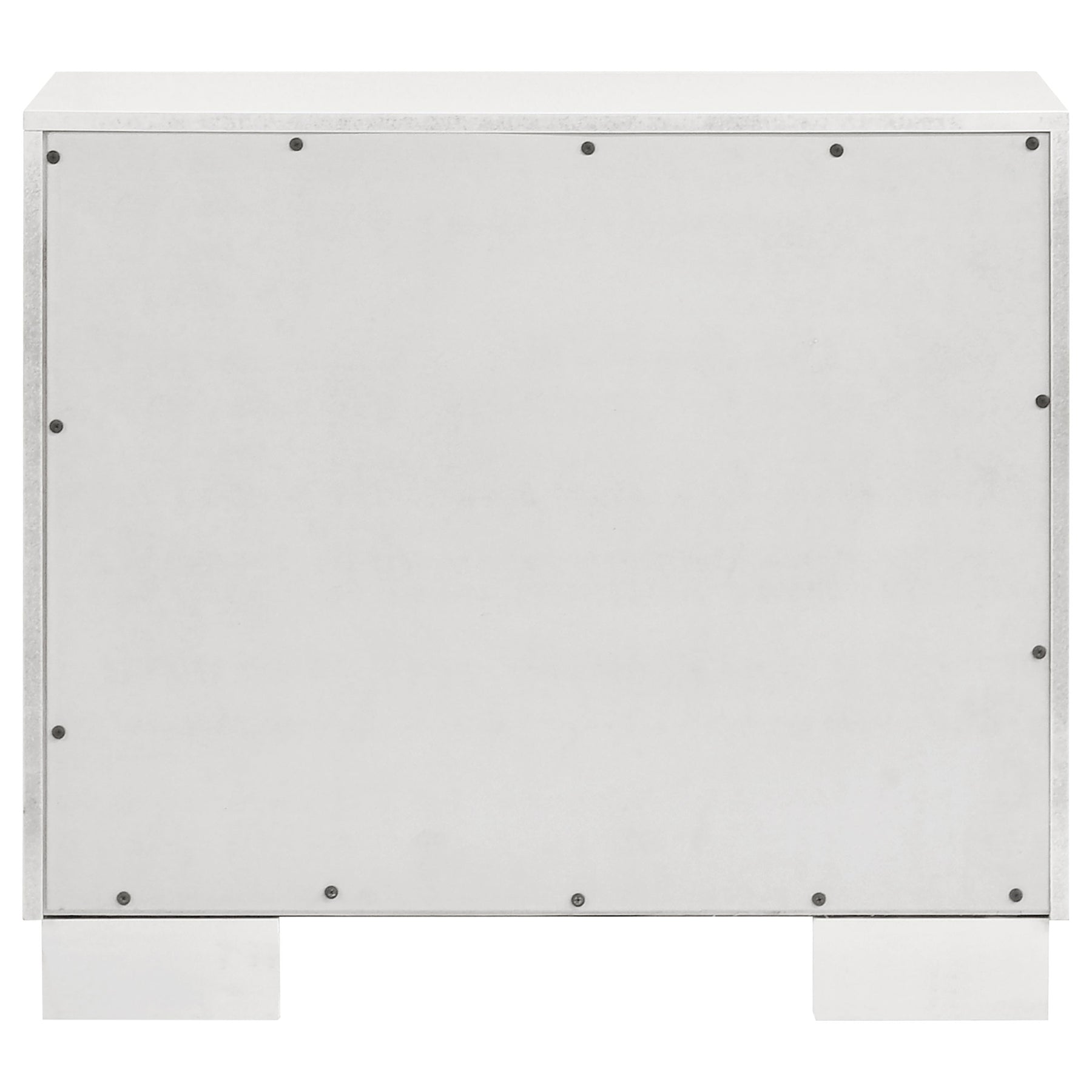 Clean lines and modern simplicity define this two-drawer nightstand, offering both style and practical storage. Each smooth-gliding drawer is felt-lined to protect delicate items, while sleek bar pulls lend a refined, contemporary accent. Constructed from durable wood and engineered materials, its sturdy form ensures everyday reliability. Ideal for bedside use, this nightstand blends functional design with a crisp, minimalist aesthetic that complements any bedroom décor._x005F_x000D_ Key Features: • Cool two-drawer nightstand with crisp geometric silhouette and clean form • Bright snow white finish delivers a fresh, contemporary visual presence • Felt-lined top drawer safeguards delicate accessories and fine jewelry • Silver-tone bar pulls enhance the sleek, minimalist modern profile • Durable rubberwood and engineered wood provide strength and stability • Fully assembled design offers immediate, ready-to-use bedside storage