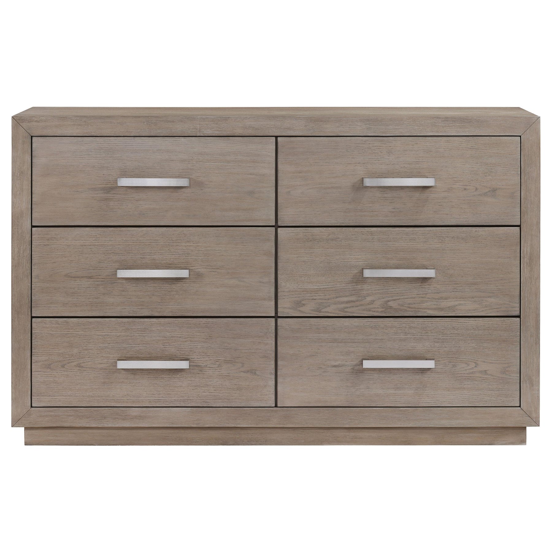 Enjoy the roomy storage and understated character of a modern six-drawer dresser. It's a fresh, understated design that showcases a wide top and recessed base that pair to deliver a timeless look. The dresser shows off wood grain details in a neutral barley brown finish, delivering stylish flair that complements in any setting. Each drawer is equally sized for easy storage and organization. Chrome finish bar pulls add a touch of contrast and textural appeal. Key Features: • Augment your bedroom with the easy, stylish storage featured in this modern six-drawer dresser • Barley brown finish is soft and neutral, offering a fresh palette for the decor of your choice • Six drawers of equal size provide ample storage for clothing, accessories and linens • Mitered trim adds dimension while chrome finish bar pulls complete the look • Recessed base lightens the look while a wide top is ideal for personal decor