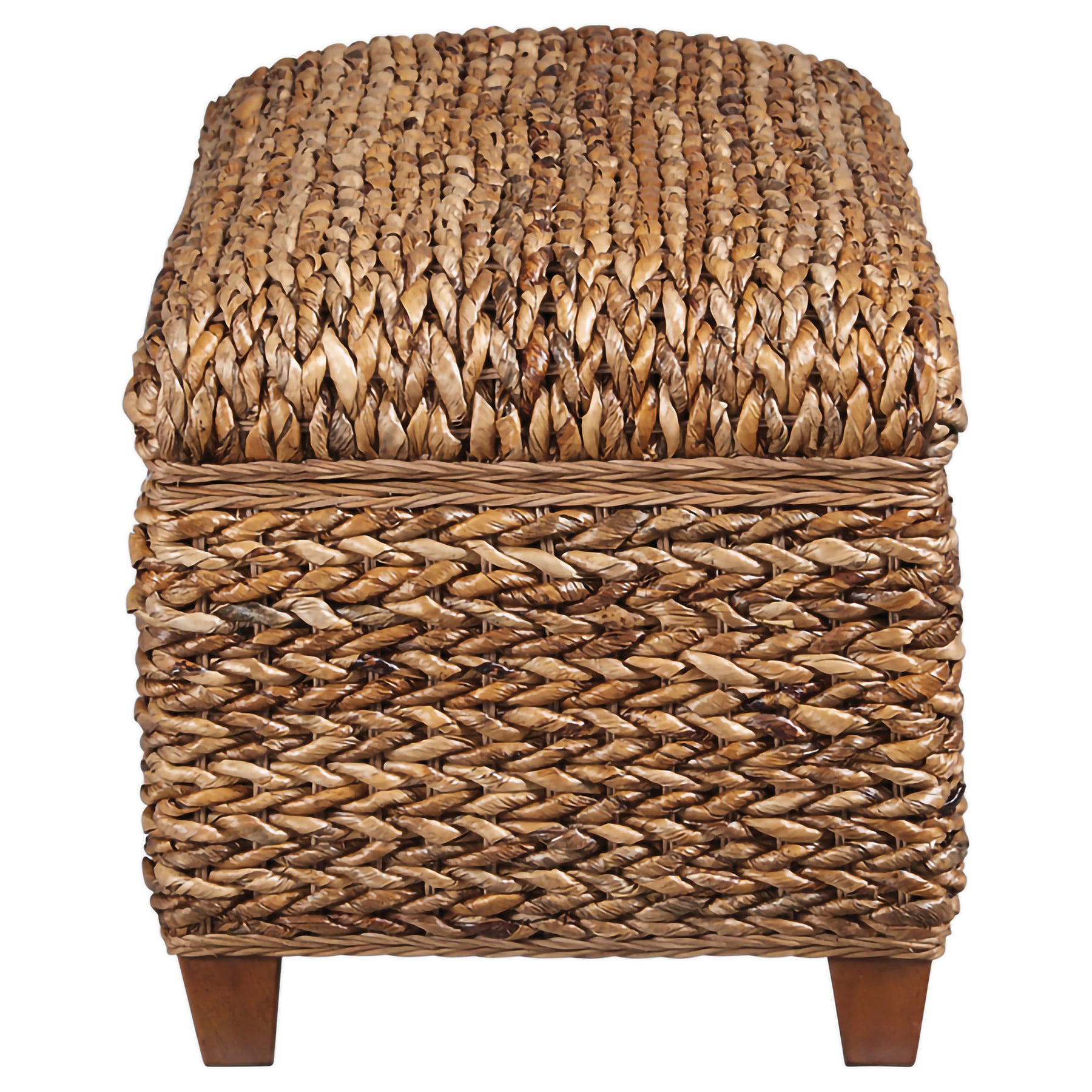 Bring warmth and functionality into your home with this hand-woven storage bench, crafted from natural banana leaf over a sturdy solid wood frame. Finished in rich amber tones, it blends rustic charm with modern country appeal. The woven texture adds organic detail, while the hinged lid lifts to reveal a spacious interior for blankets, pillows, or daily essentials. Elevated on tapered honey-finished legs, this versatile bench works beautifully at the foot of a bed, in an entryway, or as extra seating in a living space._x005F_x000D_ Key Features: • Hand-woven banana leaf storage bench with solid wood frame in warm amber finish • Rustic woven texture brings organic charm to modern country-inspired interiors • Spacious hidden storage compartment keeps blankets and essentials neatly tucked • Versatile bench design works at the foot of a bed, in an entryway, or in living rooms • Elevated honey-finished tapered legs provide stability and subtle refined detail • Durably crafted with natural banana leaf and solid wood for lasting functionality