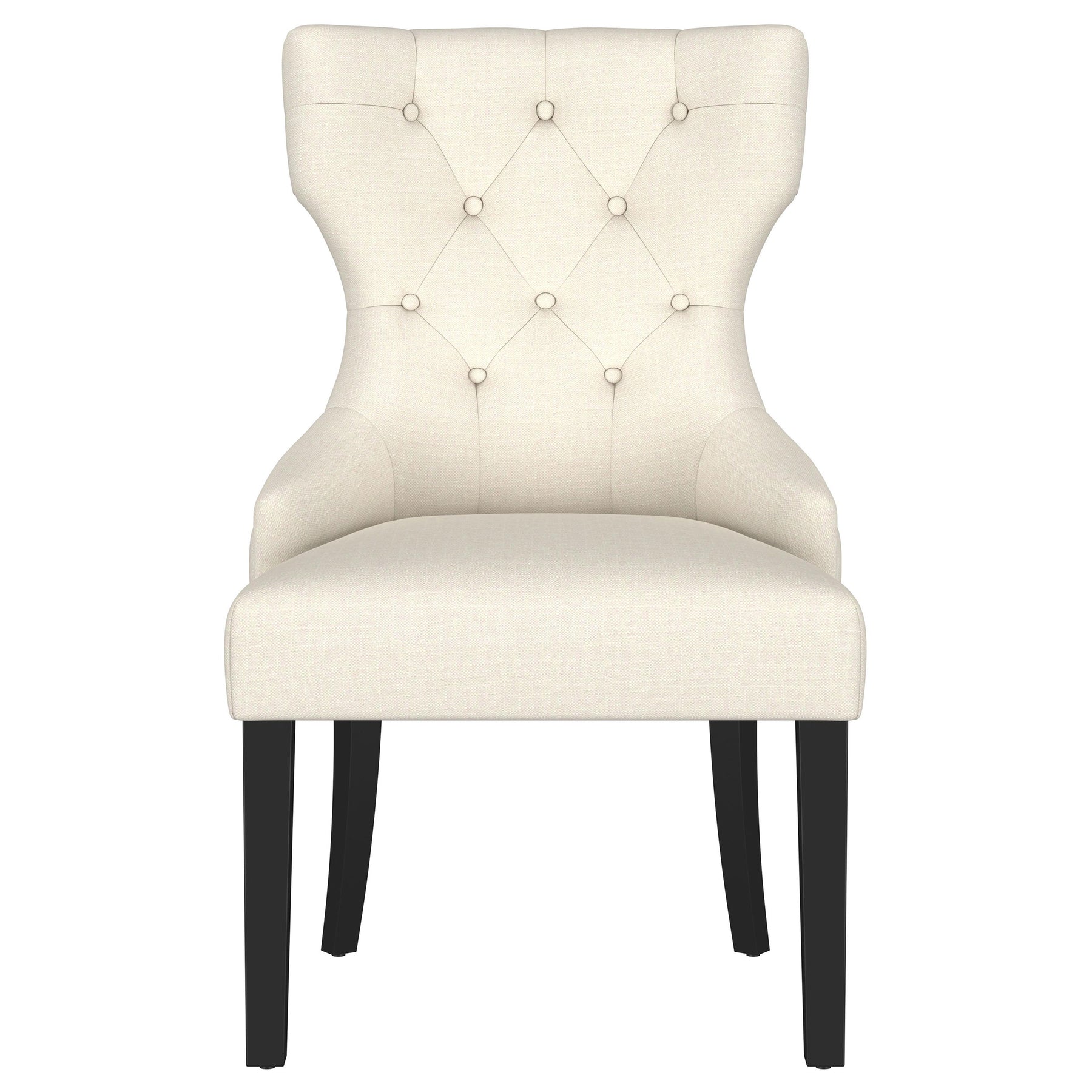 Enjoy an intriguing silhouette with a classic look. Graceful curves and angles form an eye-catching design in this dining chair. Perfect for transitional spaces, its modern design is softened with lovely beige upholstery and tufting on its seat back. Individually hand-applied nailhead trim infuses charm and style. Beautifully contrasting legs in a warm brown finish add a balanced look with curves and tapers. Key Features: • Enjoy a classic silhouette with graceful curves and angles for an eye-catching design • Perfect for transitional spaces, modern design softened with beige upholstery and tufting on seat back • Individually hand-applied nailhead trim infuses charm and style • Contrasting legs in warm brown finish add a balanced look with curves and tapers • Ideal for any room, this chair is sure to make a statement
