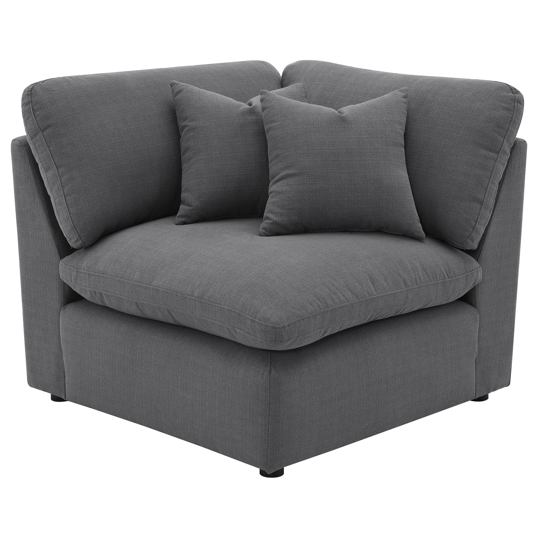 This modular sectional sofa blends modern style with luxurious comfort. Upholstered in soft performance fabric, it features feather blend-wrapped box cushions with reversible seating and backs for lasting support. Tailored topstitching and slim track arms create a sleek contemporary look, while plush accent pillows enhance comfort. Treated fabric resists moisture, allowing for easier maintenance and everyday durability. Designed for lounging, this sectional offers both elegance and versatility. Key Features: • Six-piece sectional in ivory fabric with slim track arms and tailored topstitching • Reversible seat and back cushions with feather blend filling provide soft comfort • Moisture-repellent treated fabric simplifies cleaning and everyday maintenance • Ottoman with plush cushion functions as footrest, coffee table, or extra seating • Accent pillows included to enhance comfort and complete the sectional design • Durable frame construction ensures strength and long-lasting living room use