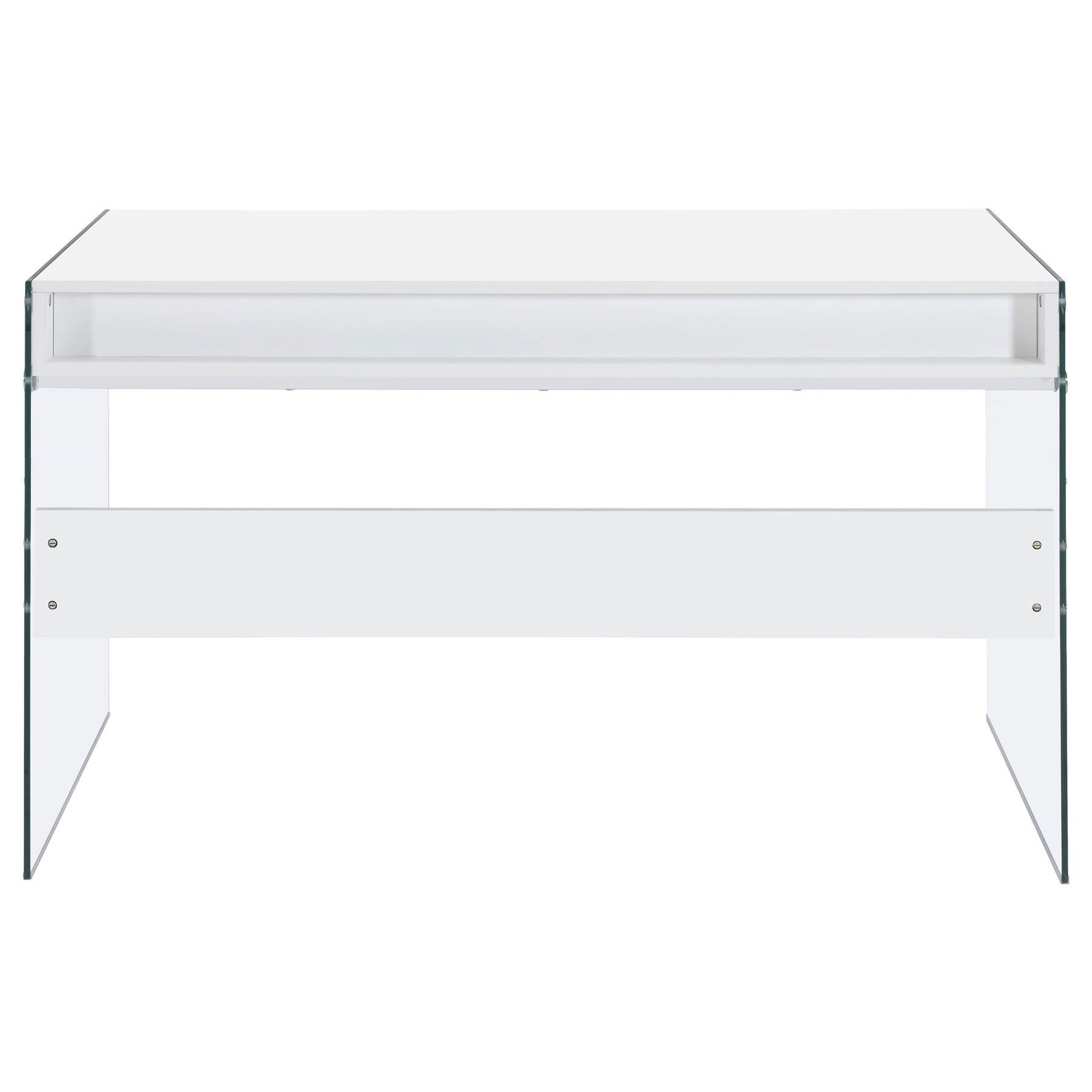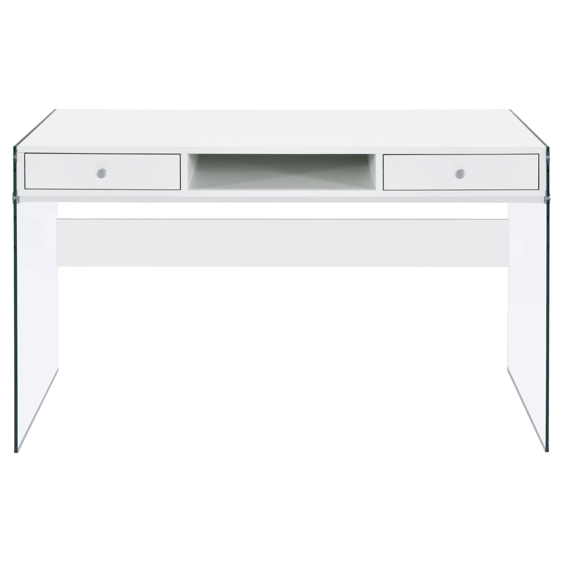 With its cool, contemporary appeal, this versatile writing desk works well in a bedroom or living room. It creates a functional space to work and study without sacrificing style. Bold, thick, tempered glass panels form its base supports, giving it an inspired touch of glamour. Its striking aesthetic is brought to life with a finish of glossy white. This desk is complete with an open center compartment and two drawers, adding extra convenience while maintaining its sleek look. Key Features: • Contemporary writing desk with clear glass side panels and white top • Two drawers and one center cubby provide storage and function • High gloss engineered wood top adds a polished modern appearance • Tempered glass legs give the desk a floating visual effect • Sleek chrome-finished knobs complement the clean white design • Ideal for minimalist bedrooms, living rooms, or compact offices